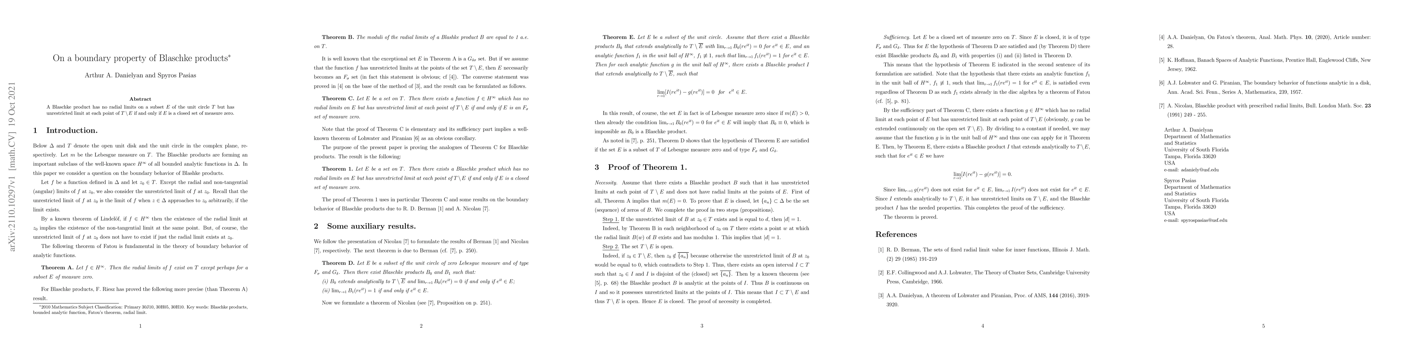 Summary: This paper explores the boundary behavior of Blaschke products, proving that they lack radial limits on a closed set of measure zero on the unit circle but exhibit unrestricted limits at all other points. This result characterizes the exceptional sets where Blaschke products fail to have radial limits.