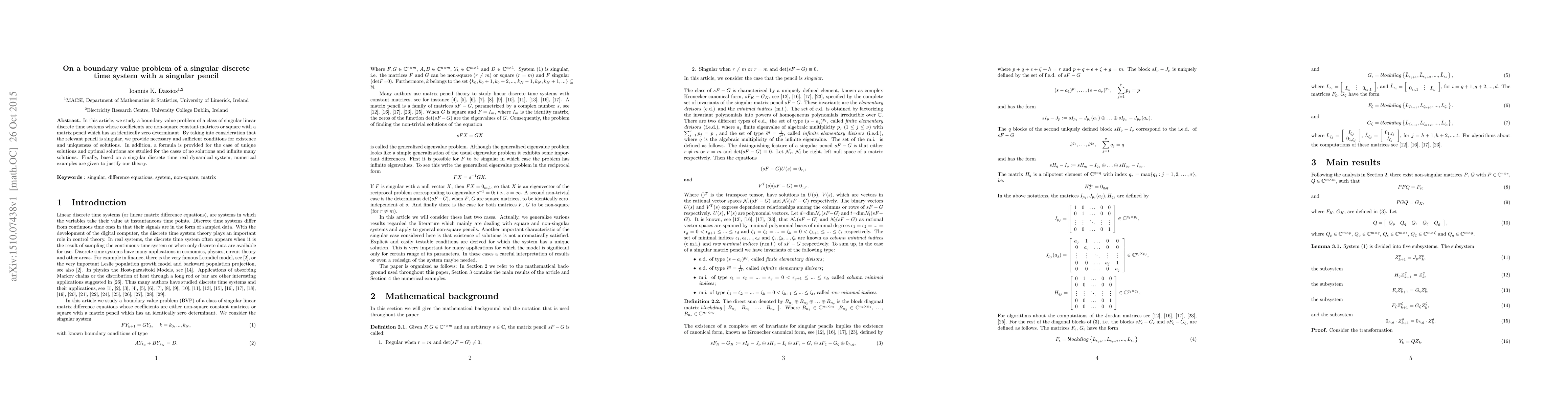 This paper studies boundary value problems for singular discrete time systems with non-square matrices or a zero determinant matrix pencil, providing conditions for existence and uniqueness of solutions.