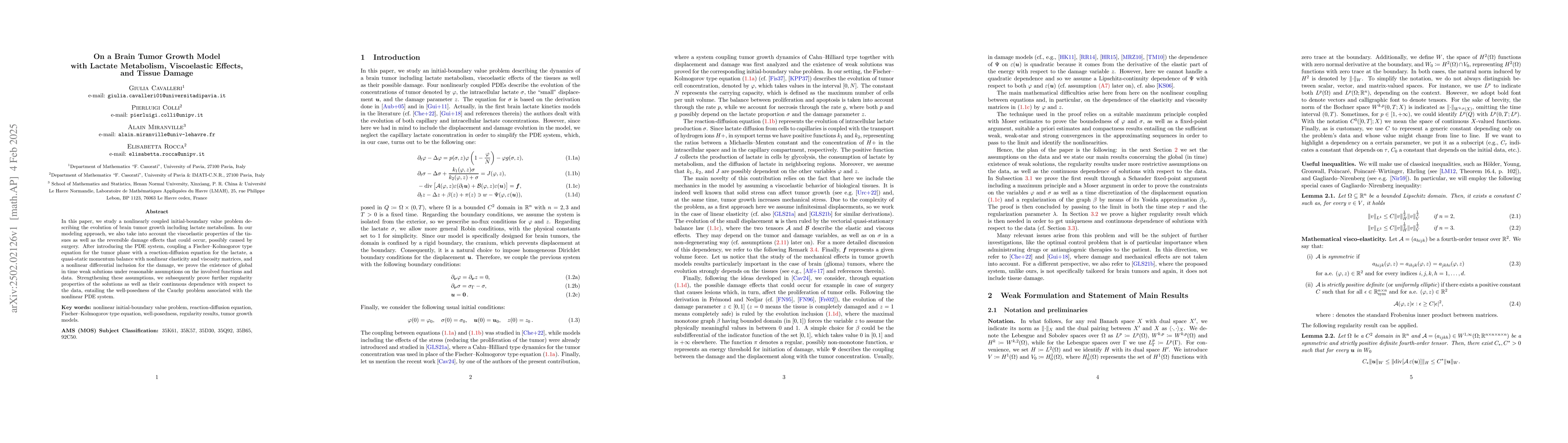 The paper presents a mathematically rigorous analysis of a complex PDE system modeling brain tumor growth, proving existence, regularity, and continuous dependence results.