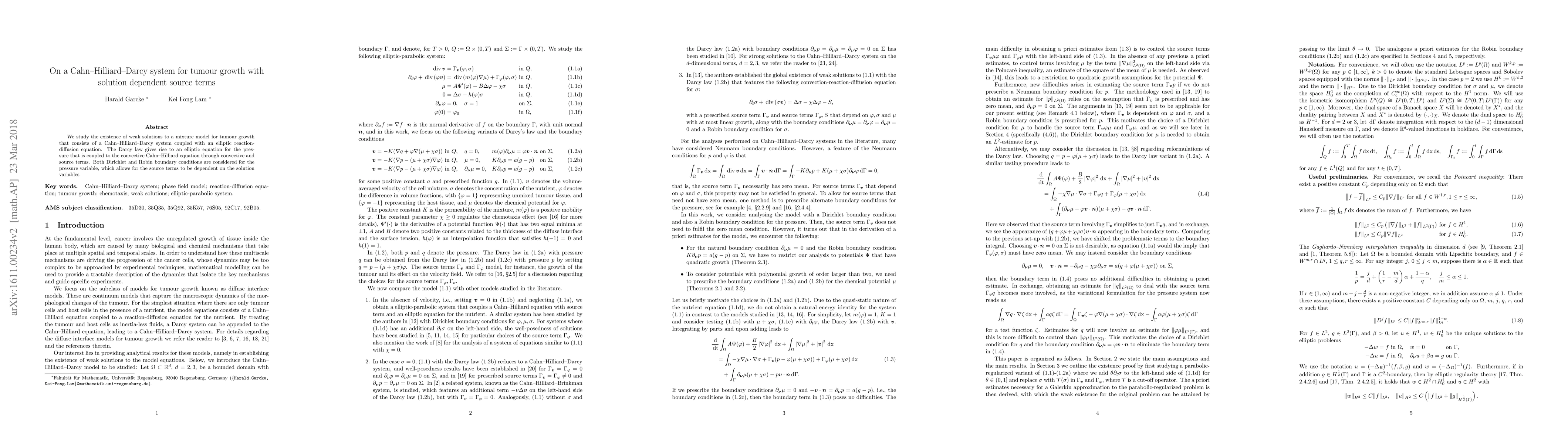 This paper investigates the existence of weak solutions for a Cahn-Hilliard-Darcy system modeling tumour growth, incorporating solution-dependent source terms. The model combines a Darcy law with a Cahn-Hilliard equation, considering both Dirichlet and Robin boundary conditions for pressure.
