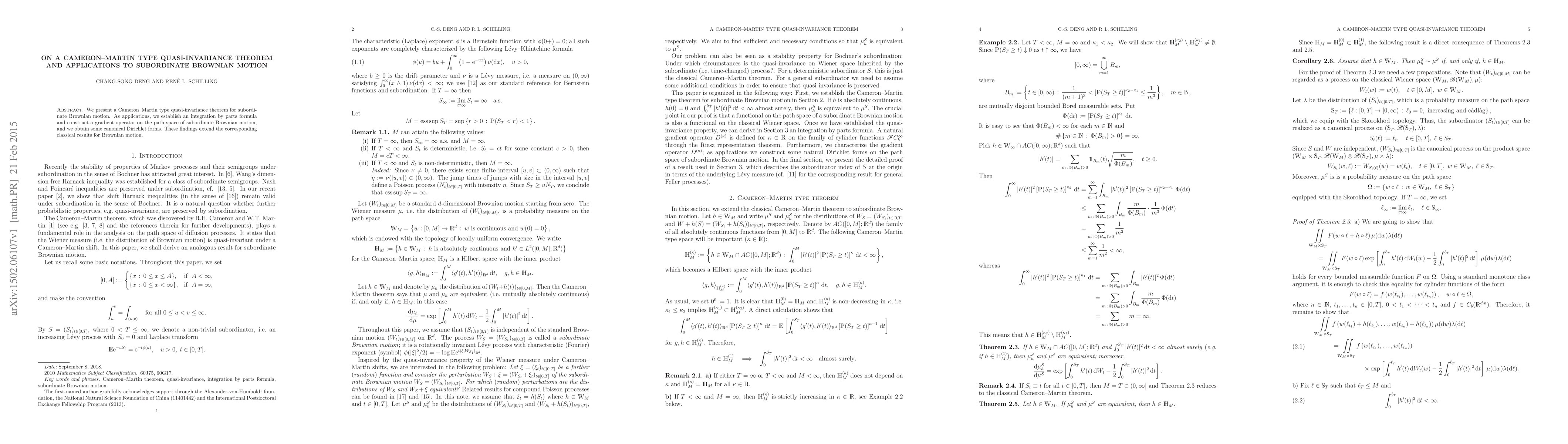 Summary: This paper introduces a Cameron--Martin type quasi-invariance theorem for subordinate Brownian motion, extending classical results for Brownian motion. It also develops an integration by parts formula, a gradient operator on the path space, and canonical Dirichlet forms.