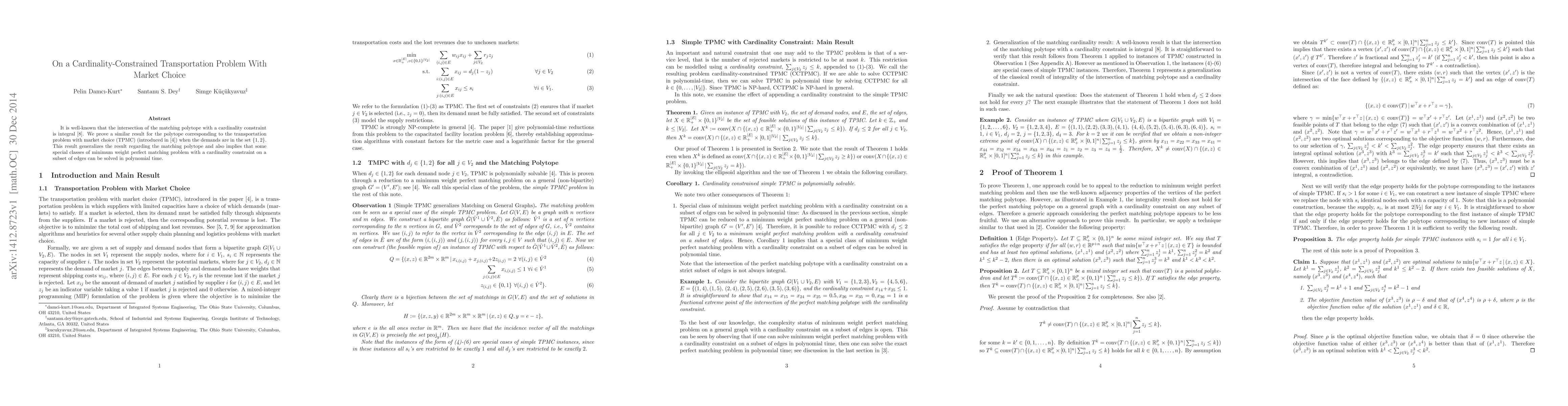 Researchers prove that a cardinality-constrained transportation problem with market choice can be solved in polynomial time for demands of 1 or 2, generalizing previous results on matching polytopes.