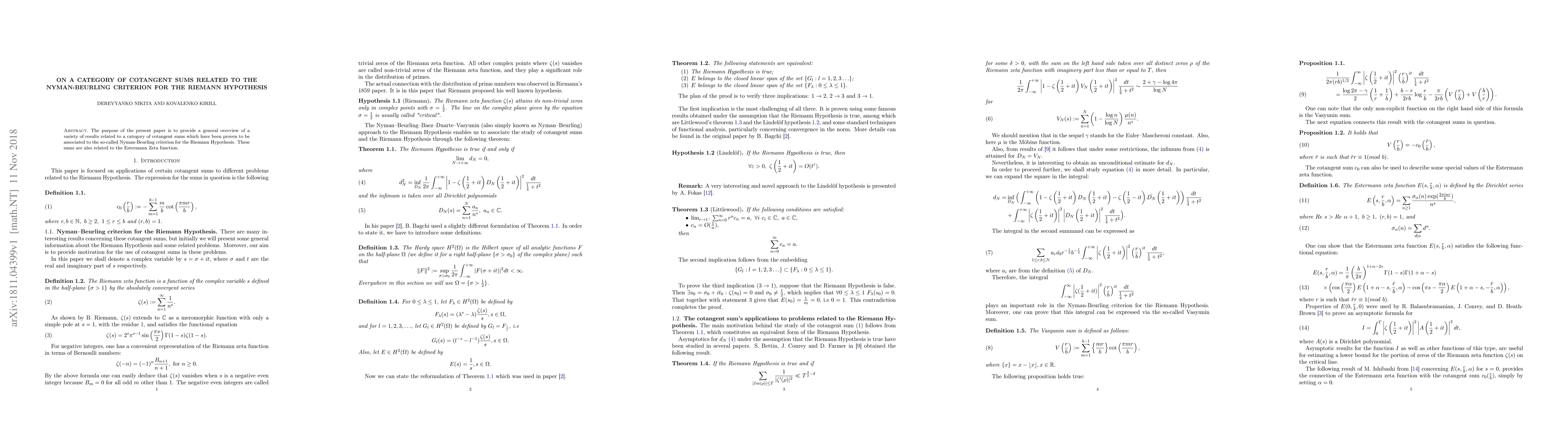 This paper reviews various results concerning cotangent sums linked to the Nyman-Beurling criterion for the Riemann Hypothesis, with connections to the Estermann Zeta function. The focus is on the mathematical relationships and implications of these cotangent sums.