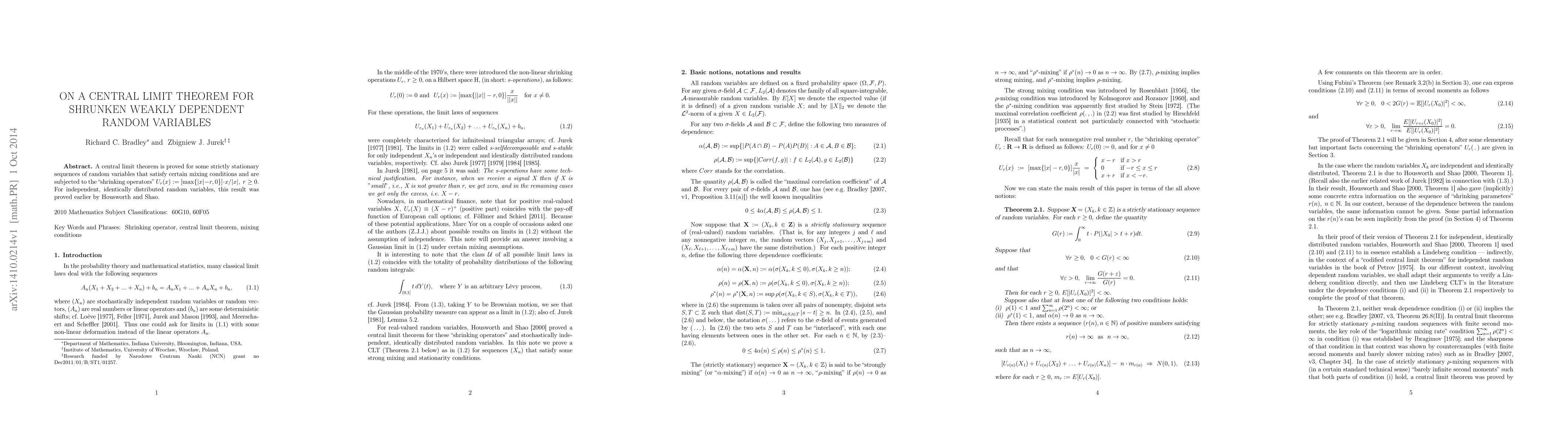 This paper proves a central limit theorem for strictly stationary sequences of weakly dependent random variables under mixing conditions, subject to shrinking operators. This extends earlier results by Housworth and Shao for independent, identically distributed variables.