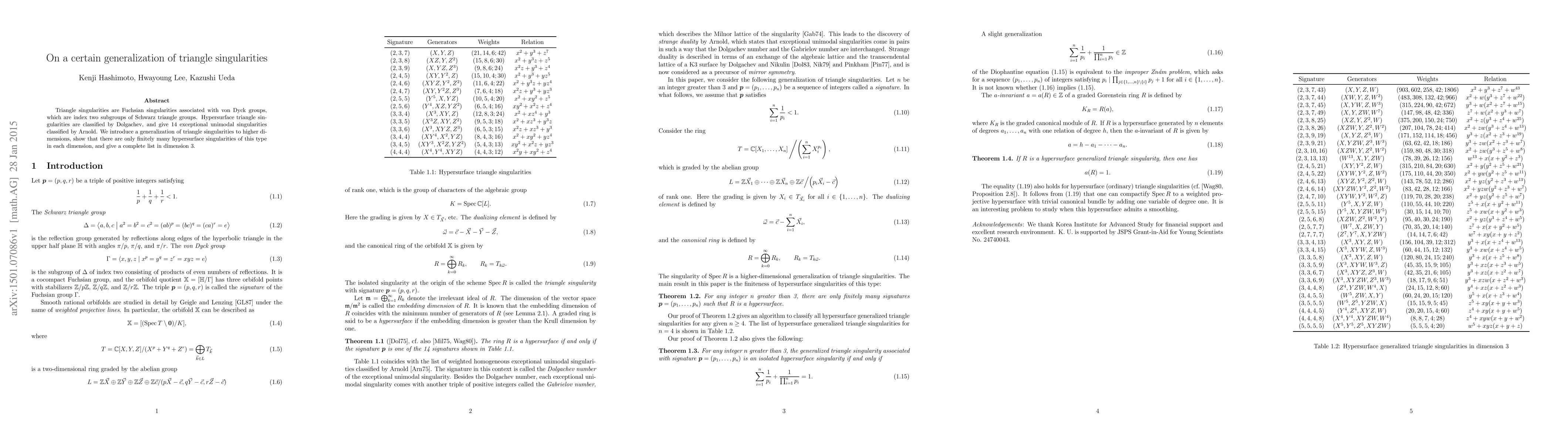 This paper generalizes triangle singularities, associated with von Dyck groups, to higher dimensions, demonstrating that there are only finitely many such singularities in each dimension and providing a complete list in dimension 3.
