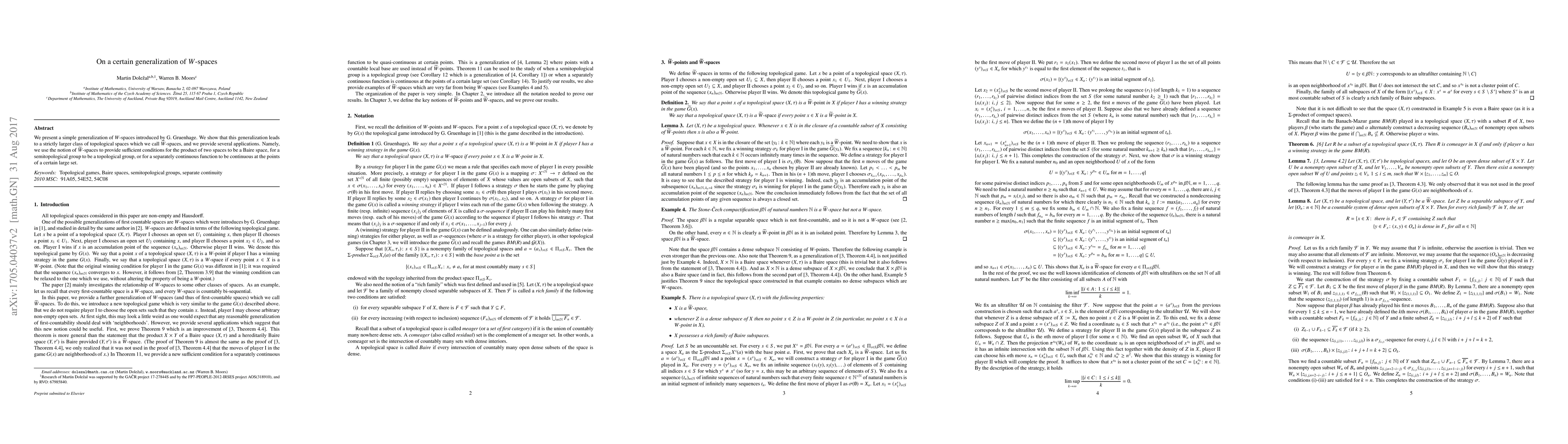 We present a simple generalization of $W$-spaces introduced by G. Gruenhage. We show that this generalization leads to a strictly larger class of topological spaces which we call $\widetilde W$-spaces, and we provide several applications. Namely, we use the notion of $\widetilde W$-spaces to provide sufficient conditions for the product of two spaces to be a Baire space, for a semitopological group to be a topological group, or for a separately continuous function to be continuous at the points of a certain large set.