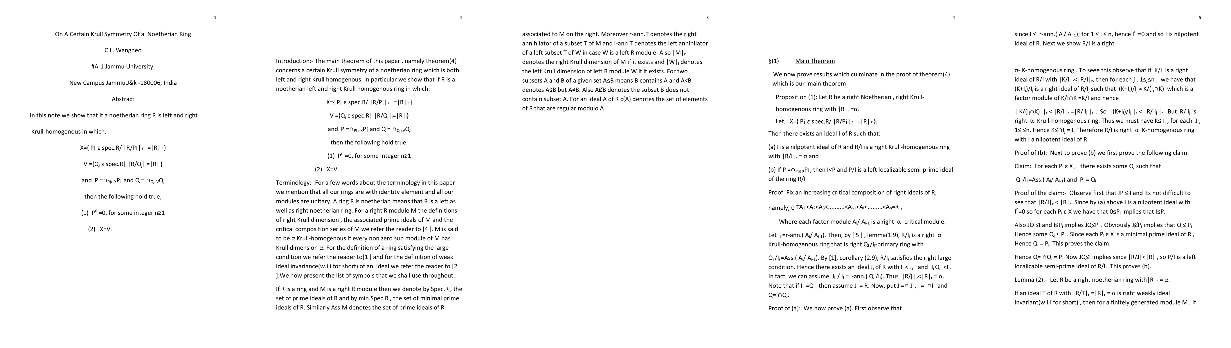 In this note we show that if a noetherian ring R is left and right Krull-homogenous and if: \Lambda ={P\textexclamdown {\epsilon} spec.R/ |R/P\textexclamdown|_r =|R|_r} and v ={Qj {\epsilon} spec.R| |R/Qj|l=|R|l} and P =\cap P\textexclamdown{\epsilon} \Lambda P\textexclamdown and Q = \cap Qj{\epsilon}VQj then the following hold true; (1) Pn =0, for some integer n\geq1 (2) \Lambda =v