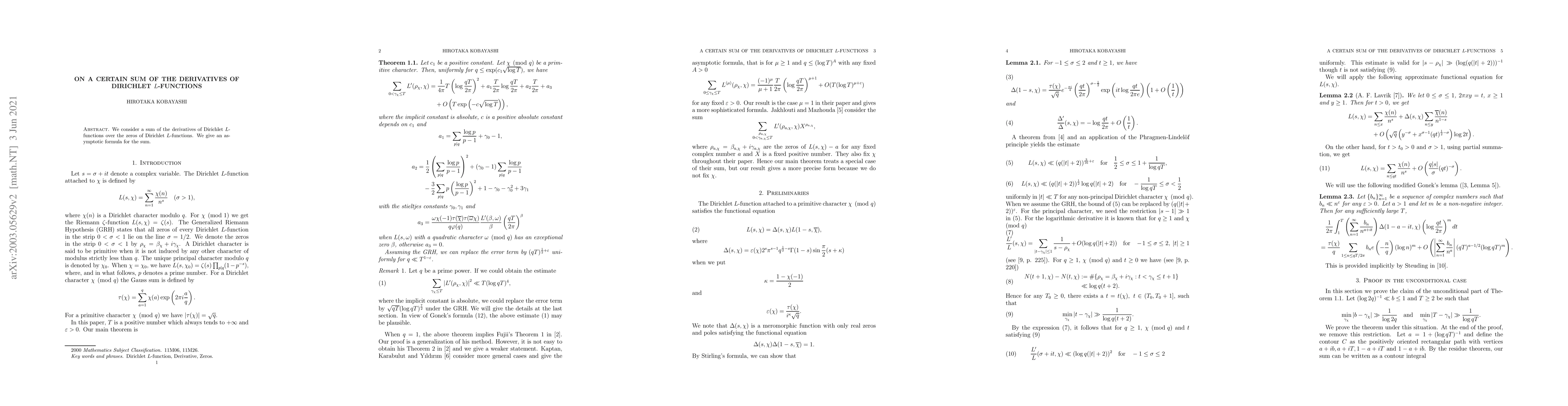 This paper provides an asymptotic formula for a sum involving the derivatives of Dirichlet $L$-functions evaluated at their zeros, contributing to the understanding of their complex behavior.