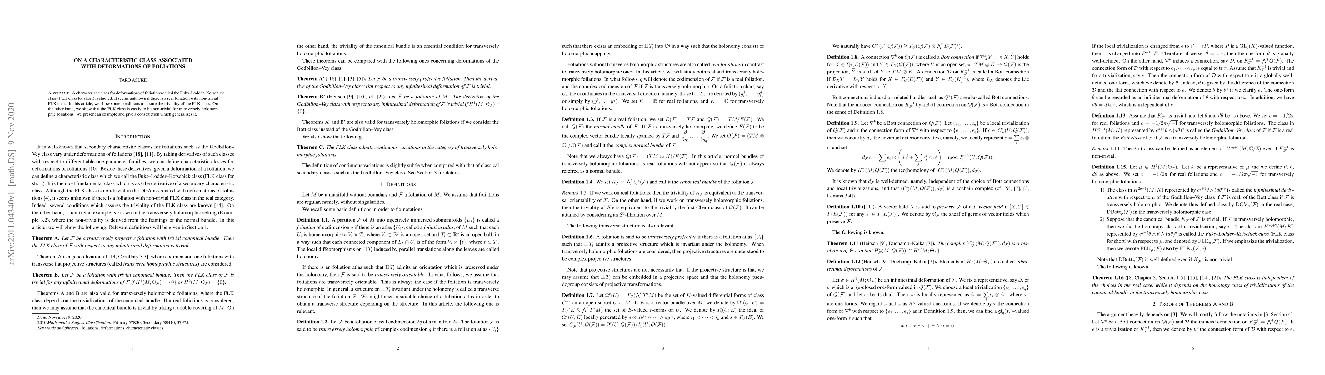This paper explores the Fuks-Lodder-Kotschick (FLK) class, a characteristic class for foliations' deformations. It establishes conditions ensuring the triviality of the FLK class while demonstrating its non-triviality for transversely holomorphic foliations through an example and a generalized construction.