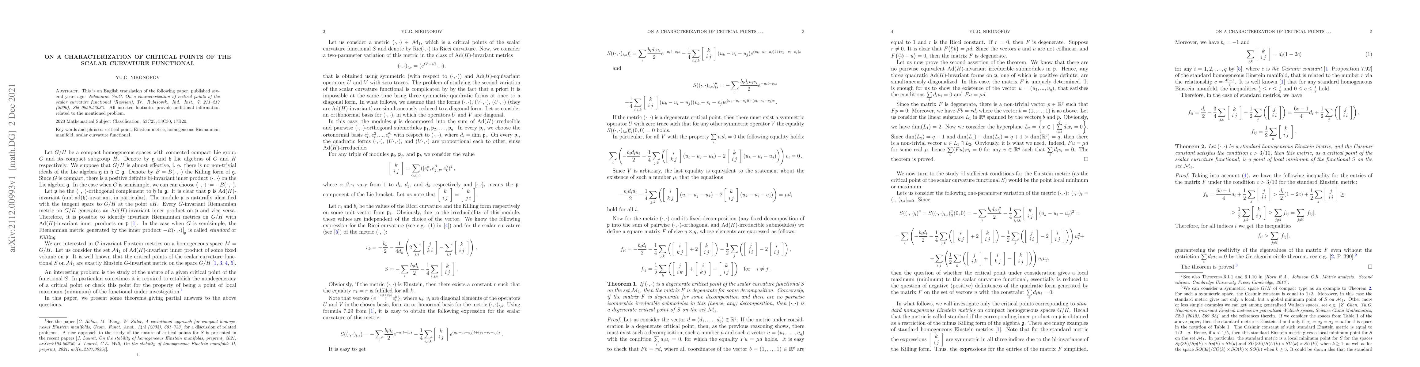 This is an English translation of the following paper, published several years ago: Nikonorov Yu.G. On a characterization of critical points of the scalar curvature functional (Russian), Tr. Rubtsovsk. Ind. Inst., 7, 211-217 (2000), Zbl. 0956.53033. All inserted footnotes provide additional information related to the mentioned problem.