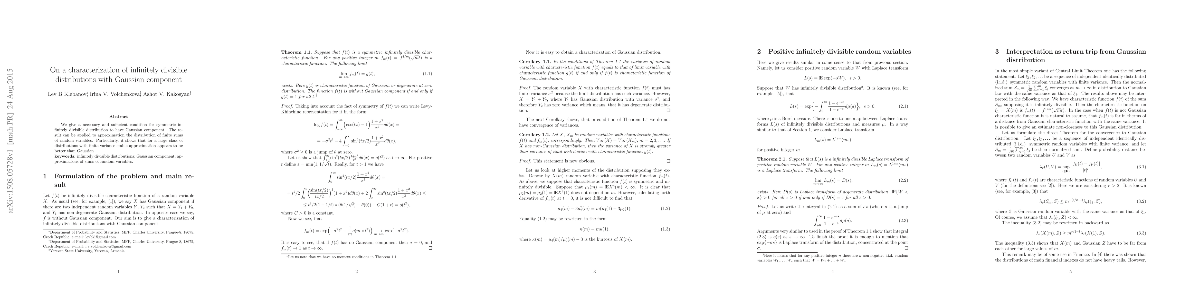 We give a necessary and sufficient condition for symmetric infinitely divisible distribution to have Gaussian component. The result can be applied to approximation the distribution of finite sums of random variables. Particularly, it shows that for a large class of distributions with finite variance stable approximation appears to be better than Gaussian. keywords: infinitely divisible distributions; Gaussian component; approximations of sums of random variables.