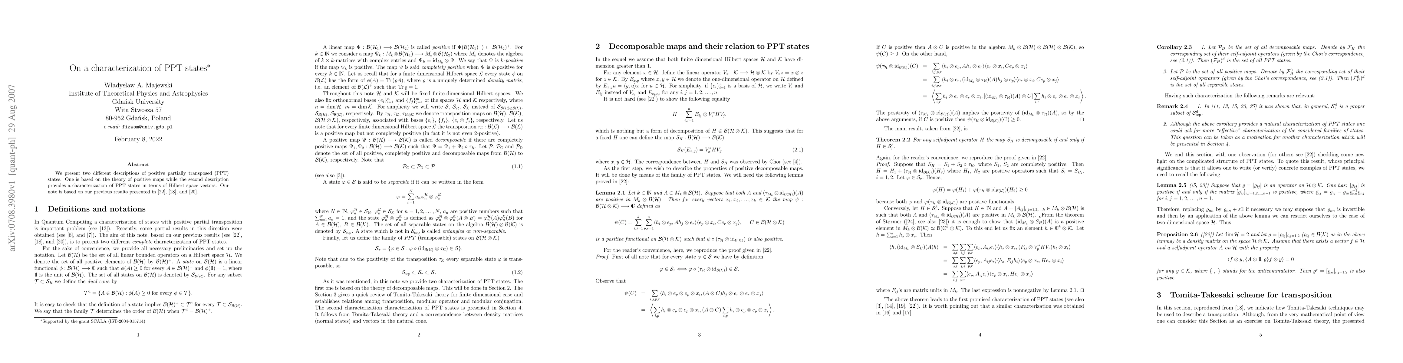 We present two different descriptions of positive partially transposed (PPT) states. One is based on the theory of positive maps while the second description provides a characterization of PPT states in terms of Hilbert space vectors. Our note is based on our previous results.
