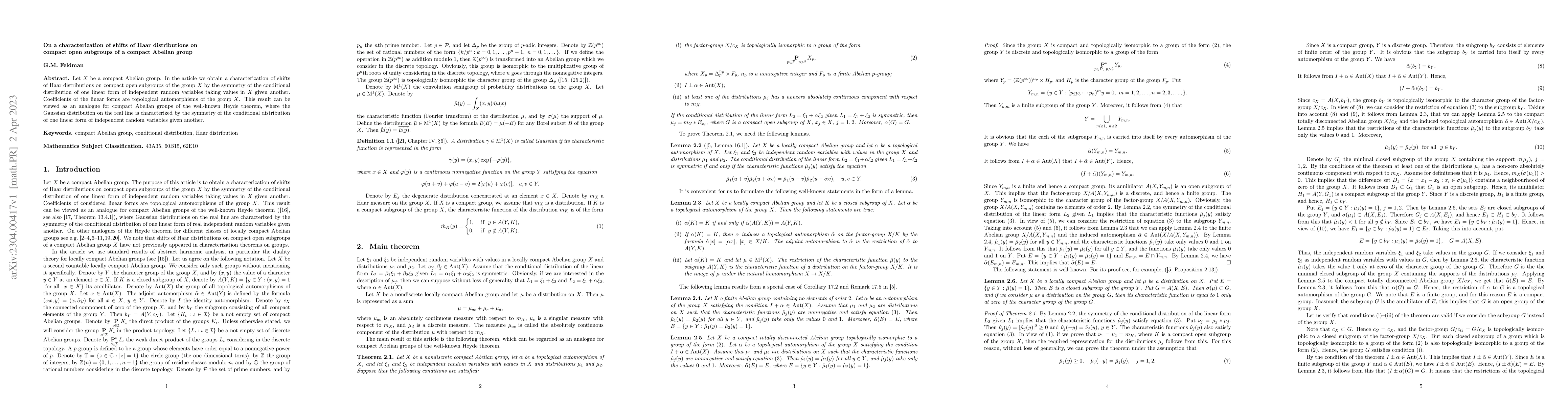This paper characterizes shifts of Haar distributions on compact open subgroups of a compact Abelian group X through the symmetry of the conditional distribution of one linear form of independent random variables in X given another. This result parallels the Heyde theorem for Gaussian distributions on the real line.