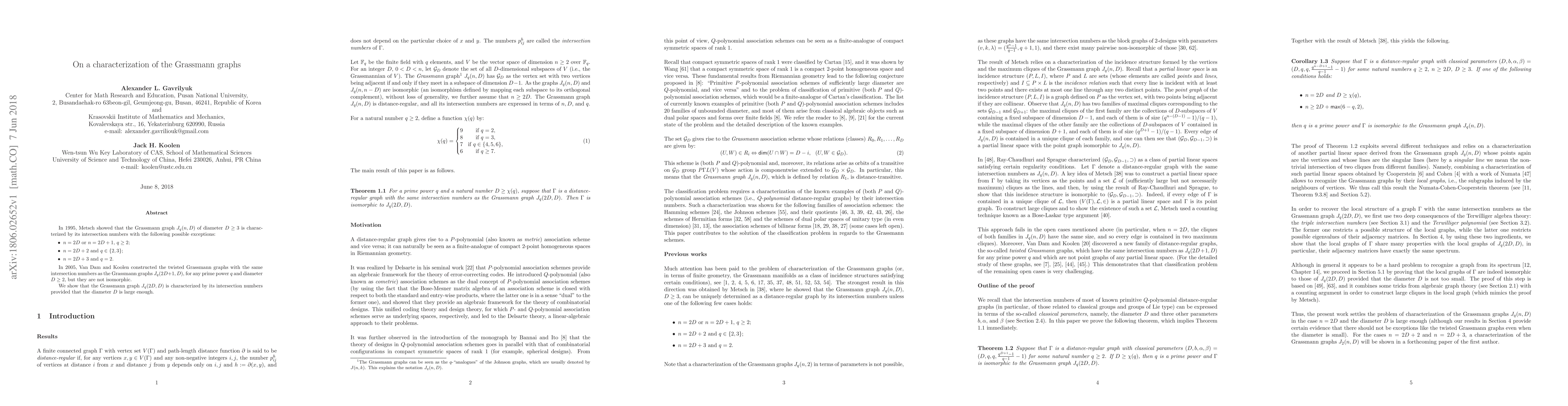 This research builds on previous work to characterize Grassmann graphs by their intersection numbers, excluding specific exceptions for small n and q values. It demonstrates that Grassmann graph J_q(2D,D) can be uniquely identified by its intersection numbers when the diameter D is sufficiently large, addressing a gap left by previous studies on twisted Grassmann graphs.