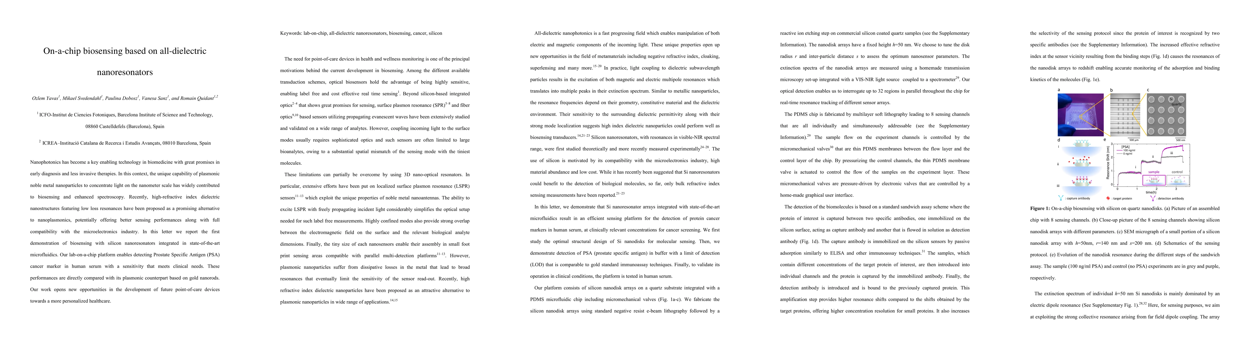 This paper demonstrates the first biosensing application using silicon nanoresonators integrated into microfluidics, achieving clinical-grade sensitivity for detecting Prostate Specific Antigen (PSA) in human serum. The study compares these dielectric nanoresonators with plasmonic gold nanorods, highlighting their potential for personalized healthcare and compatibility with microelectronics.