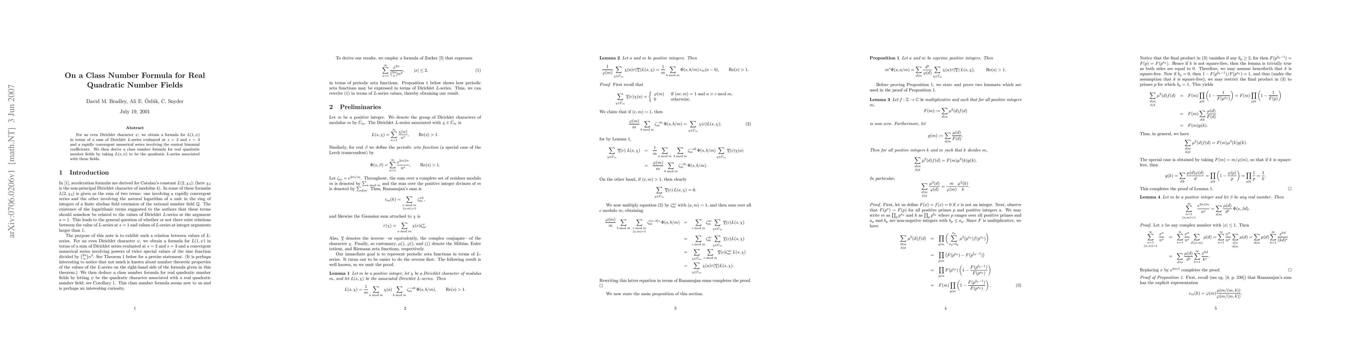 This paper derives a formula for L(1,ψ) for even Dirichlet characters ψ, linking it to Dirichlet L-series at s=2 and s=3, and a rapidly convergent series involving central binomial coefficients. It then uses this result to establish a class number formula for real quadratic number fields.