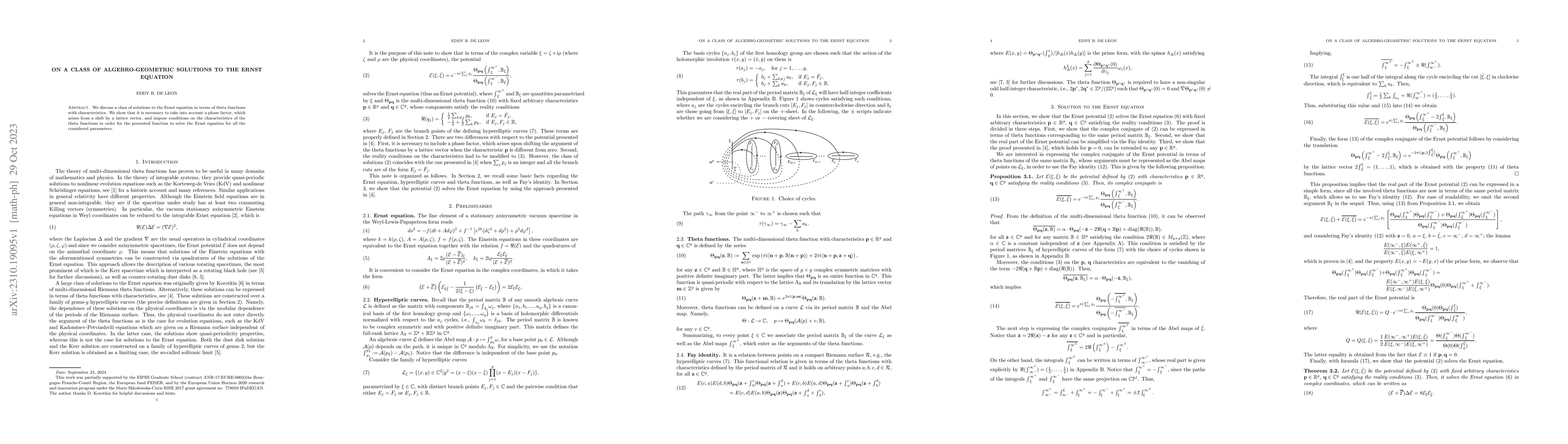 This paper explores solutions to the Ernst equation using theta functions, emphasizing the necessity of incorporating a phase factor due to lattice vector shifts and conditions on theta function characteristics for the solutions to hold across all parameters.