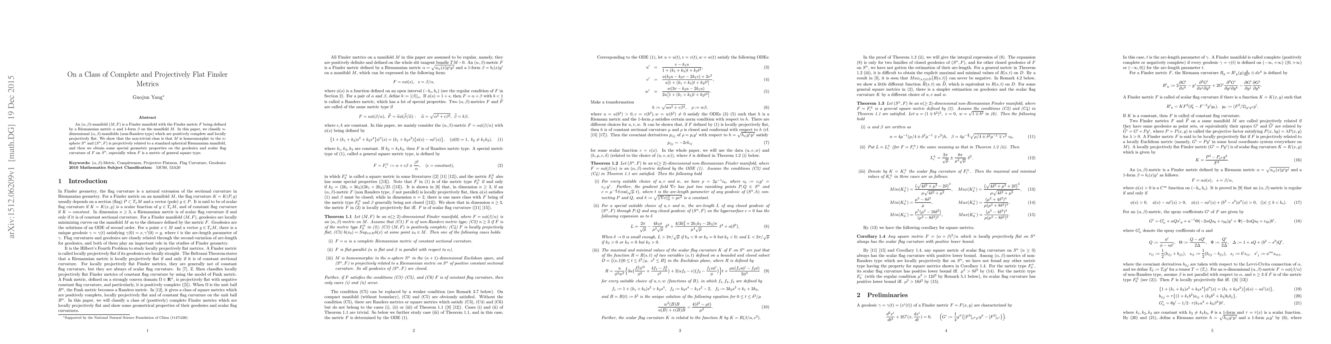 An $(\alpha,\beta)$-manifold $(M,F)$ is a Finsler manifold with the Finsler metric $F$ being defined by a Riemannian metric $\alpha$ and $1$-form $\beta$ on the manifold $M$. In this paper, we classify $n$-dimensional $(\alpha,\beta)$-manifolds (non-Randers type) which are positively complete and locally projectively flat. We show that the non-trivial class is that $M$ is homeomorphic to the $n$-sphere $S^n$ and $(S^n,F)$ is projectively related to a standard spherical Riemannian manifold, and then we obtain some special geometric properties on the geodesics and scalar flag curvature of $F$ on $S^n$, especially when $F$ is a metric of general square type.
