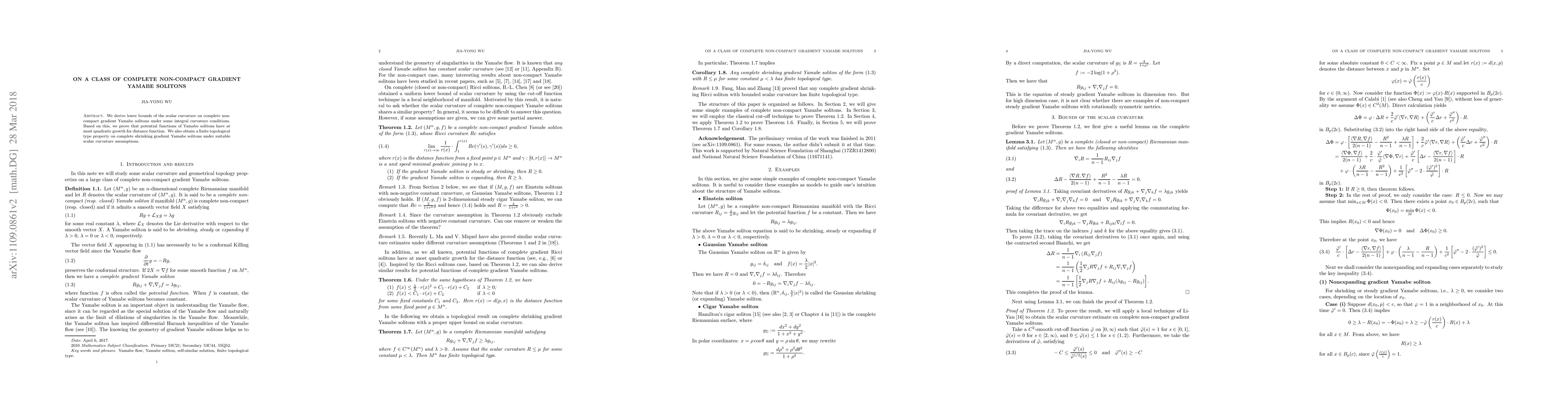 Summary: This paper establishes lower bounds on the scalar curvature for complete non-compact gradient Yamabe solitons, proving that their potential functions exhibit at most quadratic growth. It also demonstrates a finite topological type property for shrinking gradient Yamabe solitons under certain scalar curvature conditions.