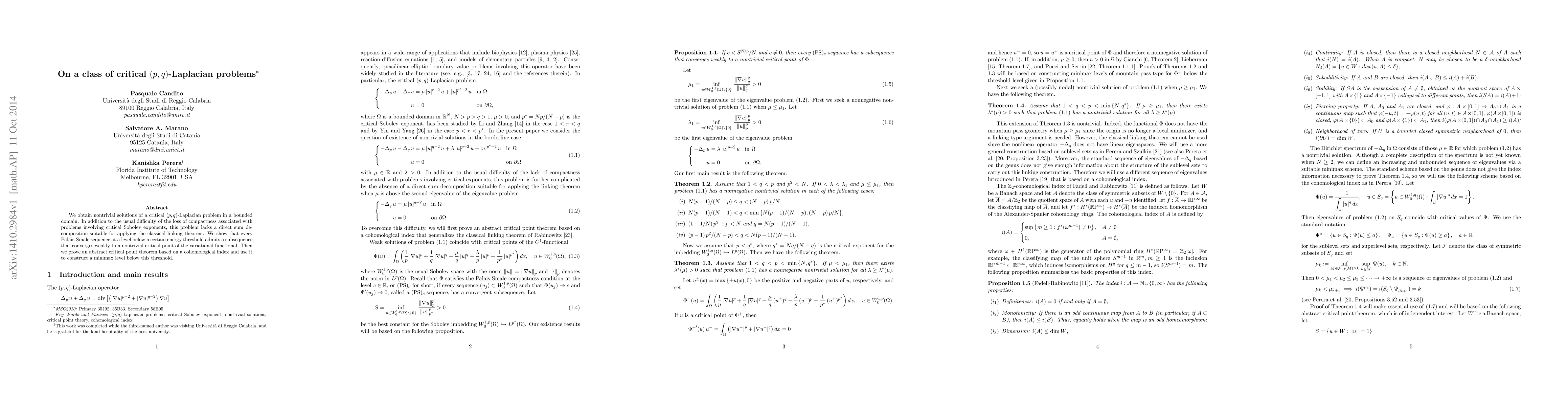 We obtain nontrivial solutions of a critical $(p,q)$-Laplacian problem in a bounded domain. In addition to the usual difficulty of the loss of compactness associated with problems involving critical Sobolev exponents, this problem lacks a direct sum decomposition suitable for applying the classical linking theorem. We show that every Palais-Smale sequence at a level below a certain energy threshold admits a subsequence that converges weakly to a nontrivial critical point of the variational functional. Then we prove an abstract critical point theorem based on a cohomological index and use it to construct a minimax level below this threshold.