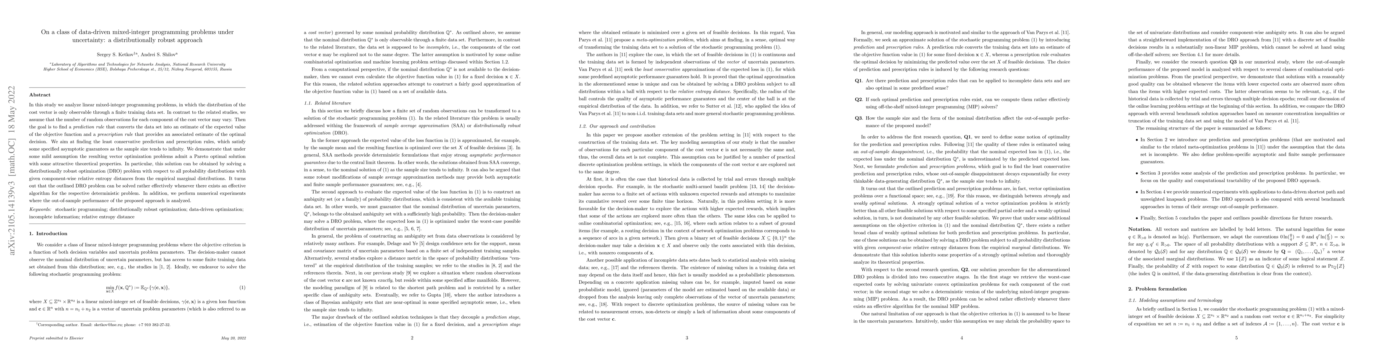 Researchers develop a method to solve data-driven mixed-integer programming problems under uncertainty using distributionally robust optimization, which aims to find the least conservative prediction and prescription rules for optimal decision-making.