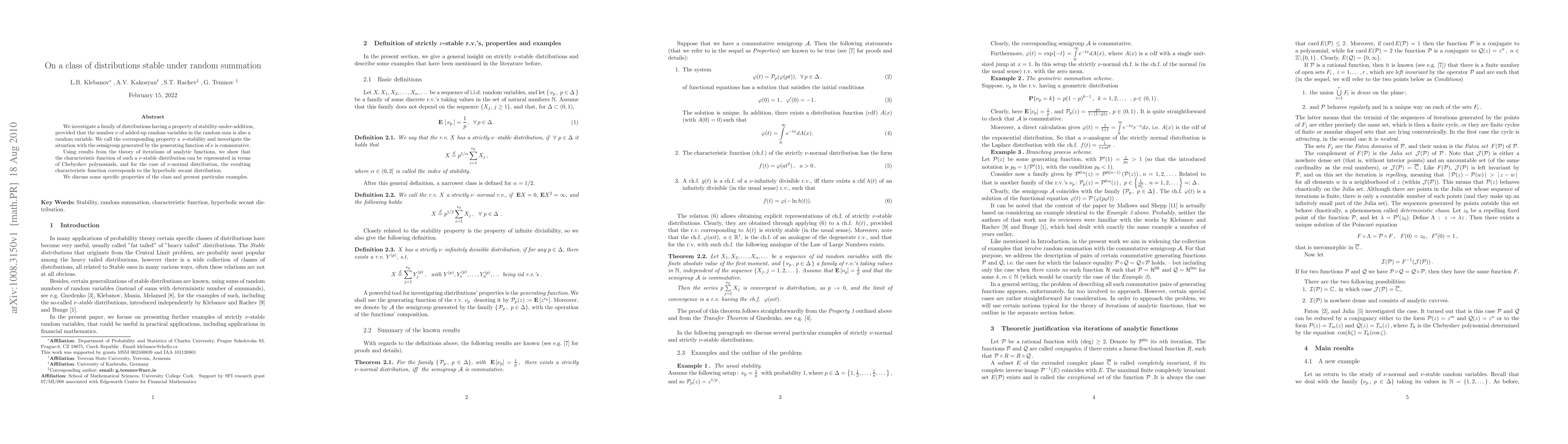 This research explores a family of distributions stable under random summation, where the number of variables in the sum is also random. Using analytic function iteration theory, it shows that the characteristic function of such distributions can be expressed via Chebyshev polynomials. For the nu-normal distribution case, the characteristic function aligns with the hyperbolic secant distribution, with specific examples and properties discussed.