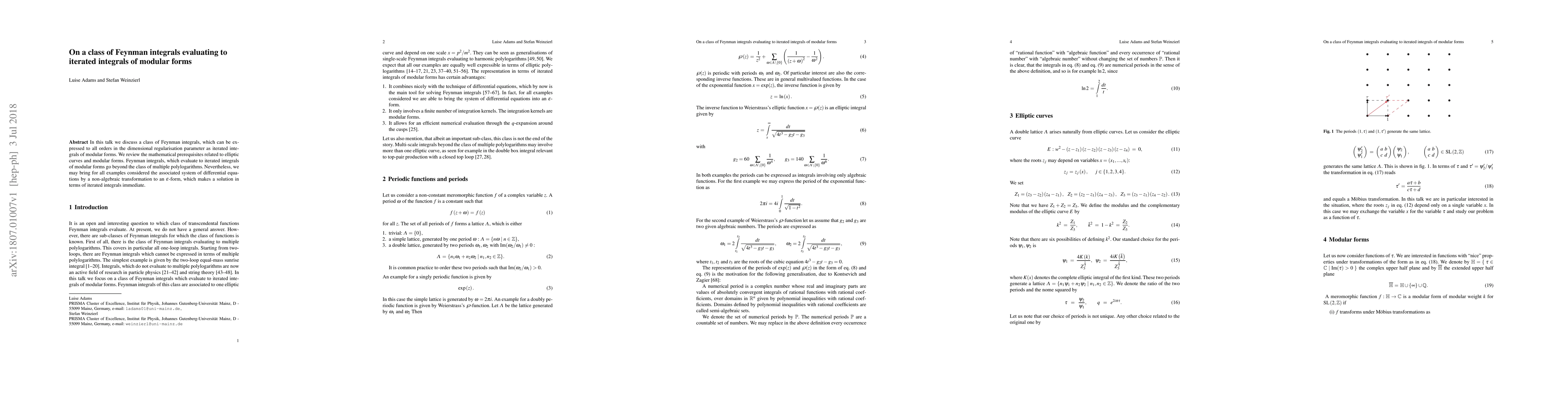 In this talk we discuss a class of Feynman integrals, which can be expressed to all orders in the dimensional regularisation parameter as iterated integrals of modular forms. We review the mathematical prerequisites related to elliptic curves and modular forms. Feynman integrals, which evaluate to iterated integrals of modular forms go beyond the class of multiple polylogarithms. Nevertheless, we may bring for all examples considered the associated system of differential equations by a non-algebraic transformation to an $\varepsilon$-form, which makes a solution in terms of iterated integrals immediate.