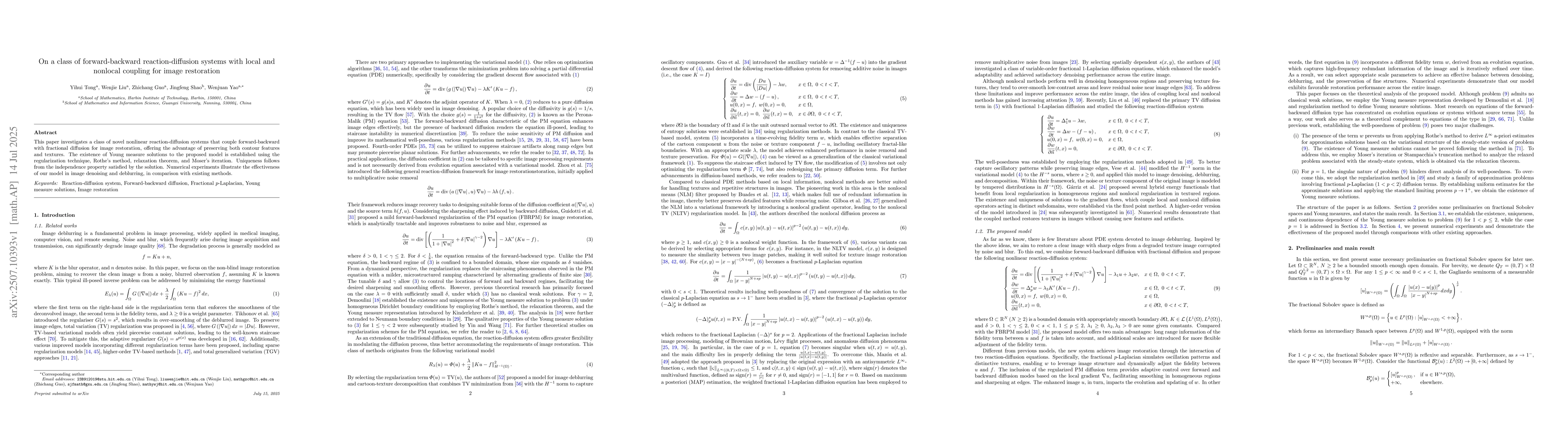 This paper investigates a class of novel nonlinear reaction-diffusion systems that couple forward-backward with fractional diffusion for image restoration, offering the advantage of preserving both contour features and textures. The existence of Young measure solutions to the proposed model is established using the regularization technique, Rothe's method, relaxation theorem, and Moser's iteration. Uniqueness follows from the independence property satisfied by the solution. Numerical experiments illustrate the effectiveness of our model in image denoising and deblurring, in comparison with existing methods.