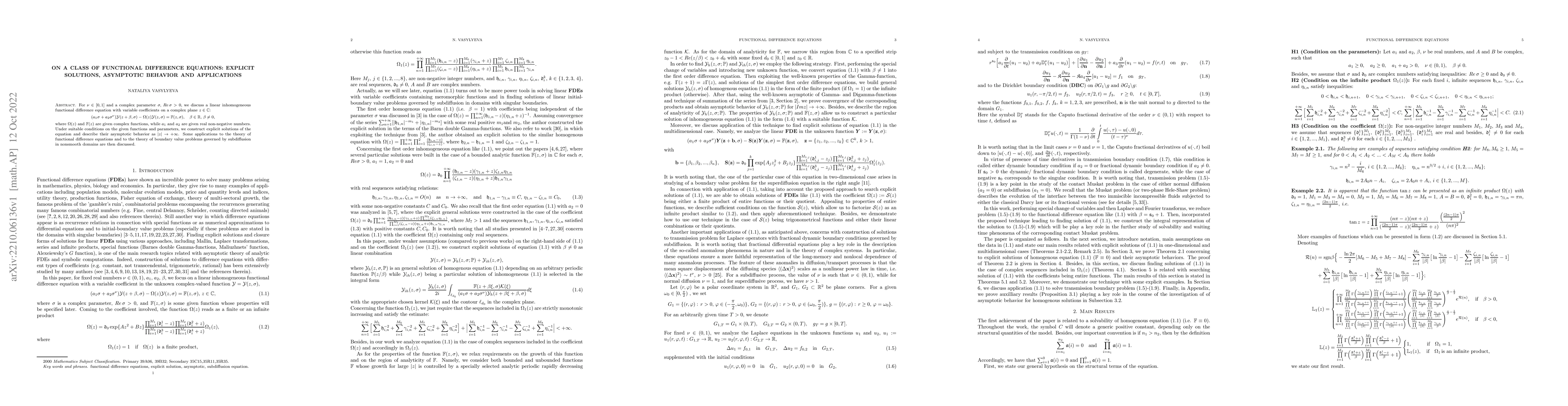For $\nu\in[0,1]$ and a complex parameter $\sigma,$ $Re\, \sigma>0,$ we discuss a linear inhomogeneous functional difference equation with variable coefficients on a complex plane $z\in\mathbb{C}$: \[ (a_{1}\sigma+a_{2}\sigma^{\nu})\mathcal{Y}(z+\beta,\sigma)-\Omega(z)\mathcal{Y}(z,\sigma)=\mathbb F(z,\sigma), \quad\beta\in\mathbb{R},\, \beta\neq 0, \] where $\Omega(z)$ and $\mathbb{F}(z)$ are given complex functions, while $a_{1}$ and $a_{2}$ are given real non-negative numbers. Under suitable conditions on the given functions and parameters, we construct explicit solutions of the equation and describe their asymptotic behavior as $|z|\to +\infty$. Some applications to the theory of functional difference equations and to the theory of boundary value problems governed by subdiffusion in nonsmooth domains are then discussed.
