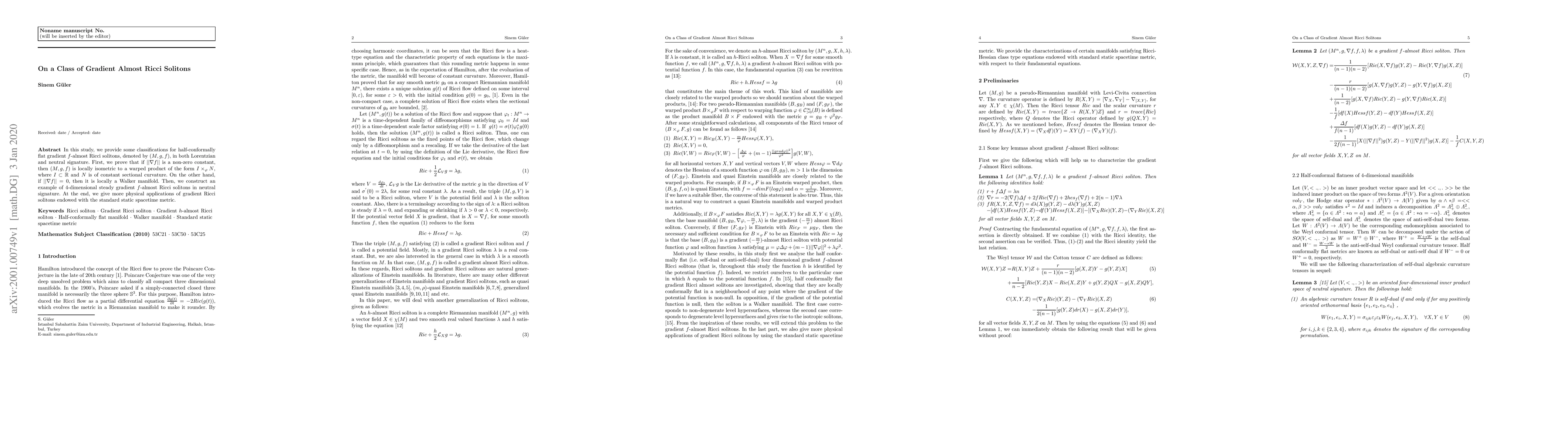In this study, we provide some classifications for half-conformally flat gradient $f$-almost Ricci solitons, denoted by $(M, g, f)$, in both Lorentzian and neutral signature. First, we prove that if $||\nabla f||$ is a non-zero constant, then $(M, g, f)$ is locally isometric to a {warped product} of the form $I \times_{\varphi} N$, where $I \subset \mathbb{R}$ and $N$ is of constant sectional curvature. On the other hand, if $||\nabla f|| = 0$, then it is locally a {Walker manifold}. Then, we construct an example of 4-dimensional steady gradient $f$-almost Ricci solitons in neutral signature. At the end, we give more physical applications of gradient Ricci solitons endowed with the standard static spacetime metric.