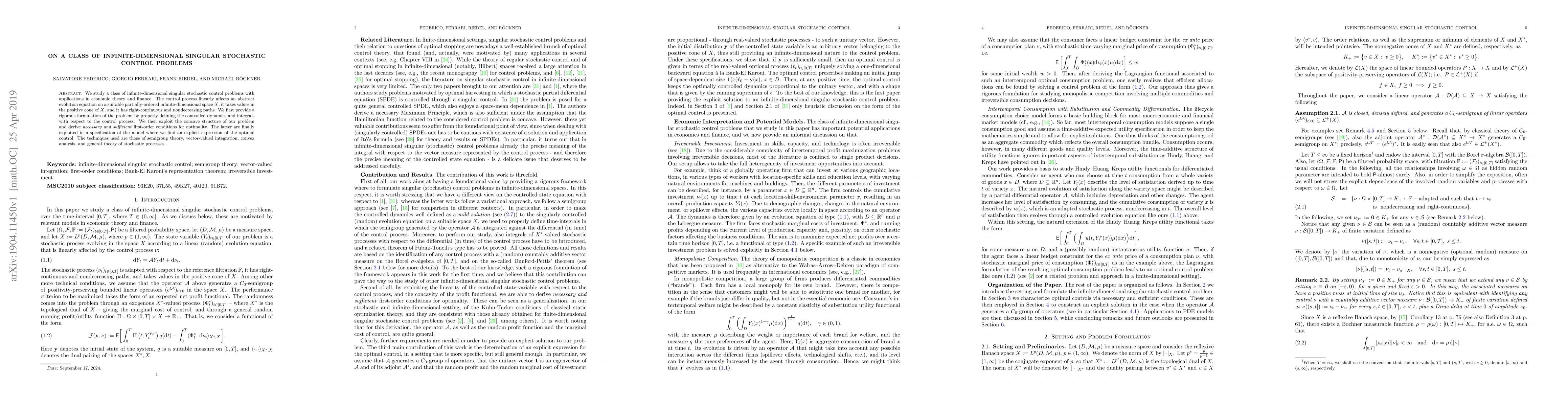 This paper investigates infinite-dimensional singular stochastic control problems with applications in economic theory and finance. It employs semigroup theory and convex analysis to derive necessary and sufficient conditions for optimality and finds an explicit expression for the optimal control.
