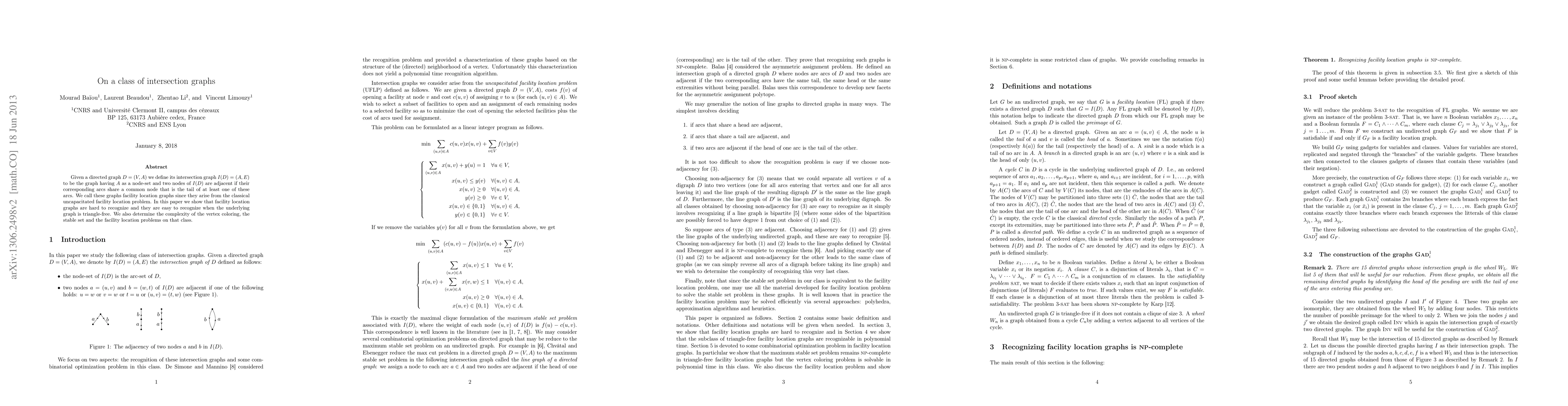 This paper explores the recognition and complexity of intersection graphs derived from directed graphs, termed facility location graphs. It demonstrates that recognizing these graphs is challenging in general but becomes tractable when they are triangle-free, and it analyzes the complexity of vertex coloring, stable set, and facility location problems within this class.