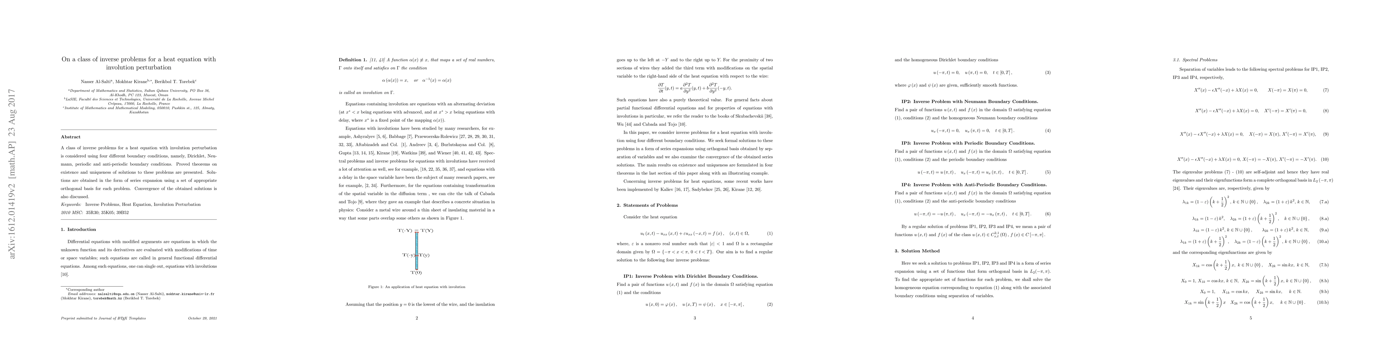 This paper investigates inverse problems for a heat equation with involution perturbation under four boundary conditions. It proves existence and uniqueness of solutions, which are derived via series expansions using orthogonal bases, and discusses the convergence of these solutions.