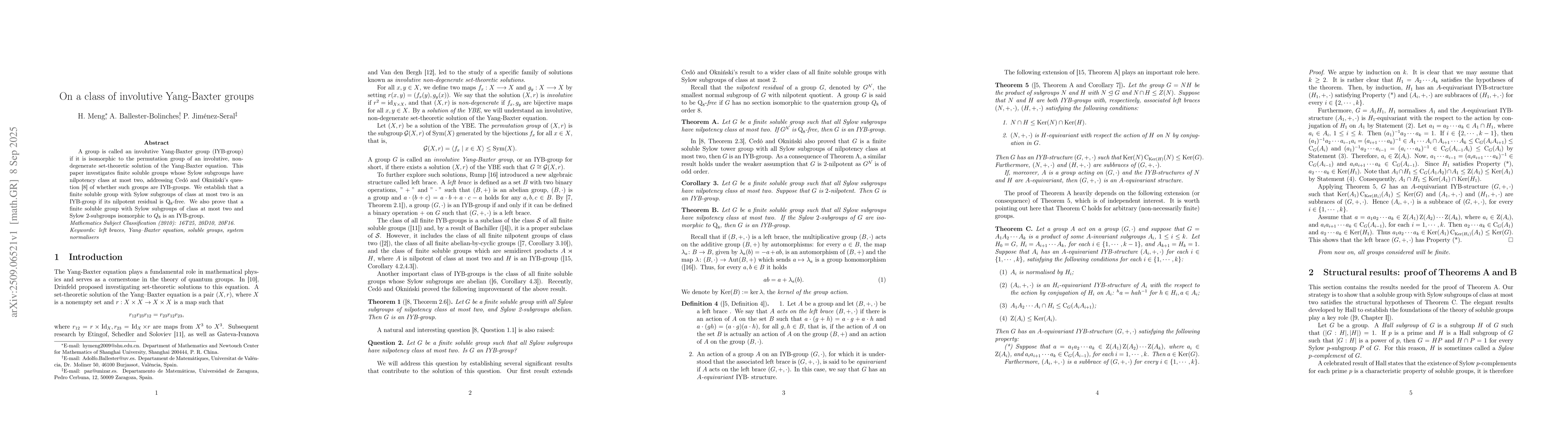 A group is called an involutive Yang-Baxter group (IYB-group) if it is isomorphic to the permutation group of an involutive, non-degenerate set-theoretic solution of the Yang-Baxter equation. This paper investigates finite soluble groups whose Sylow subgroups have nilpotency class at most two, addressing Ced\'{o} and Okni\'{n}ski's question~\cite{CedoOkninski2025} of whether such groups are IYB-groups. We establish that a finite soluble group with Sylow subgroups of class at most two is an IYB-group if its nilpotent residual is $\Q_8$-free. We also prove that a finite soluble group with Sylow subgroups of class at most two and Sylow $2$-subgroups isomorphic to $Q_8$ is an IYB-group.