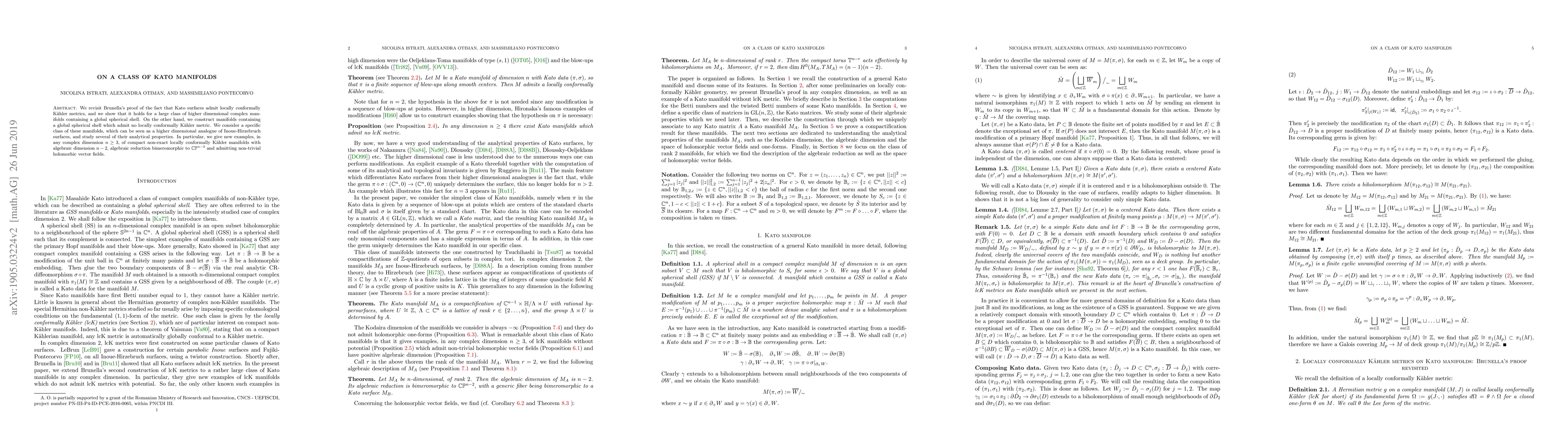We revisit Brunella's proof of the fact that Kato surfaces admit locally conformally K\" ahler metrics, and we show that it holds for a large class of higher dimensional complex manifolds containing a global spherical shell. On the other hand, we construct manifolds containing a global spherical shell which admit no locally conformally K\"ahler metric. We consider a specific class of these manifolds, which can be seen as a higher dimensional analogue of Inoue-Hirzebruch surfaces, and study several of their analytical properties. In particular, we give new examples, in any complex dimension $n \geq 3$, of compact non-exact locally conformally K\" ahler manifolds with algebraic dimension $n-2$, algebraic reduction bimeromorphic to $\mathbb{C}\mathbb{P}^{n-2}$ and admitting non-trivial holomorhic vector fields.
