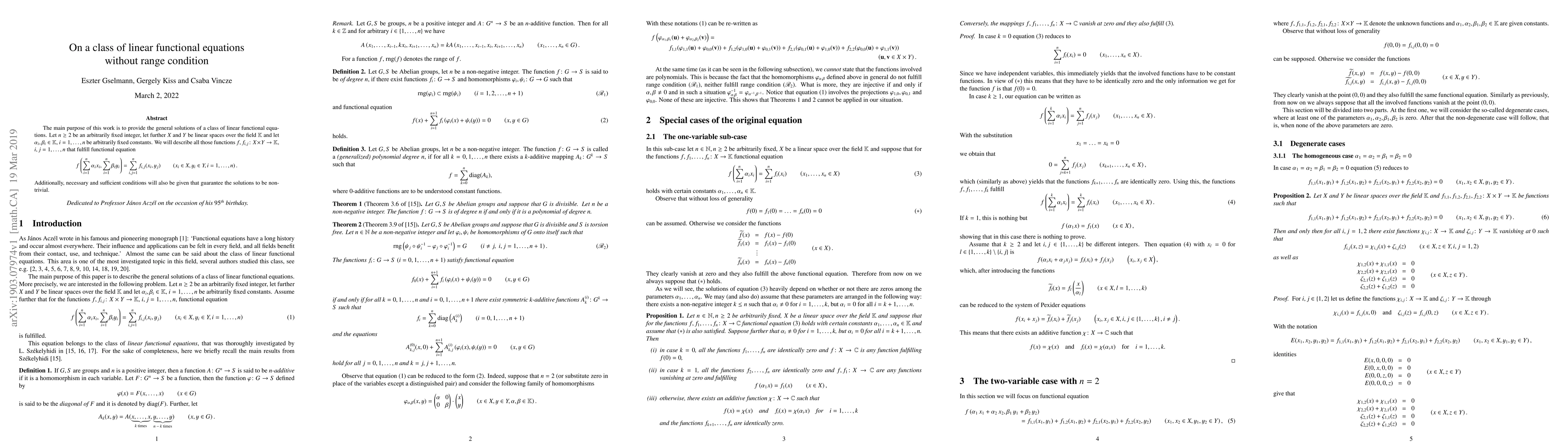 This paper presents general solutions for a specific class of linear functional equations, involving functions f and f_ij from linear spaces X and Y over field K, without requiring a range condition. It also provides conditions for non-trivial solutions.
