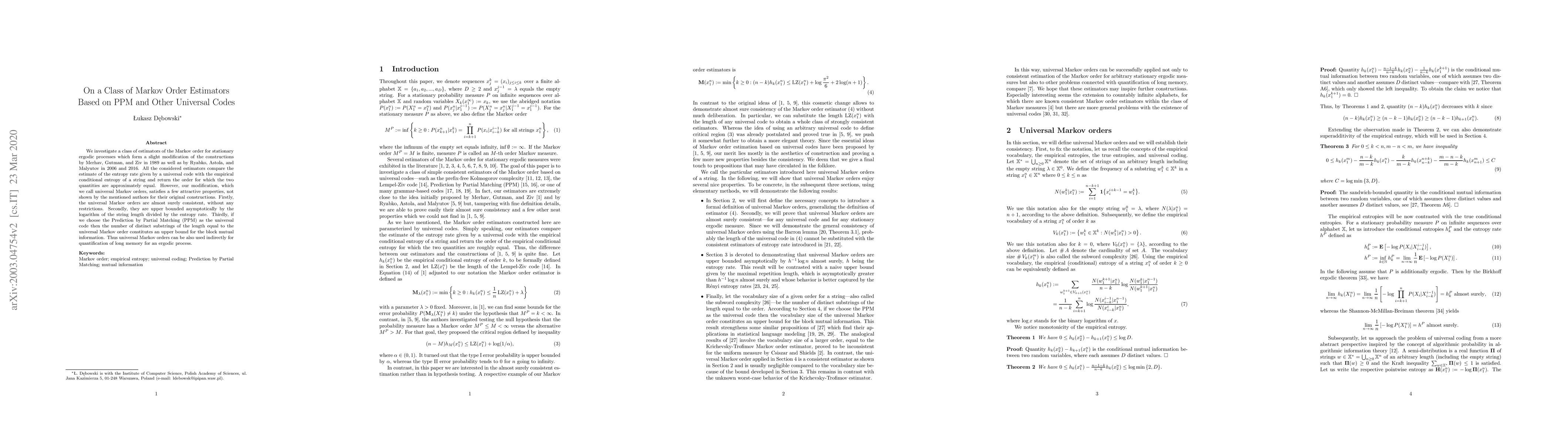 We investigate a class of estimators of the Markov order for stationary ergodic processes which form a slight modification of the constructions by Merhav, Gutman, and Ziv in 1989 as well as by Ryabko, Astola, and Malyutov in 2006 and 2016. All the considered estimators compare the estimate of the entropy rate given by a universal code with the empirical conditional entropy of a string and return the order for which the two quantities are approximately equal. However, our modification, which we call universal Markov orders, satisfies a few attractive properties, not shown by the mentioned authors for their original constructions. Firstly, the universal Markov orders are almost surely consistent, without any restrictions. Secondly, they are upper bounded asymptotically by the logarithm of the string length divided by the entropy rate. Thirdly, if we choose the Prediction by Partial Matching (PPM) as the universal code then the number of distinct substrings of the length equal to the universal Markov order constitutes an upper bound for the block mutual information. Thus universal Markov orders can be also used indirectly for quantification of long memory for an ergodic process.