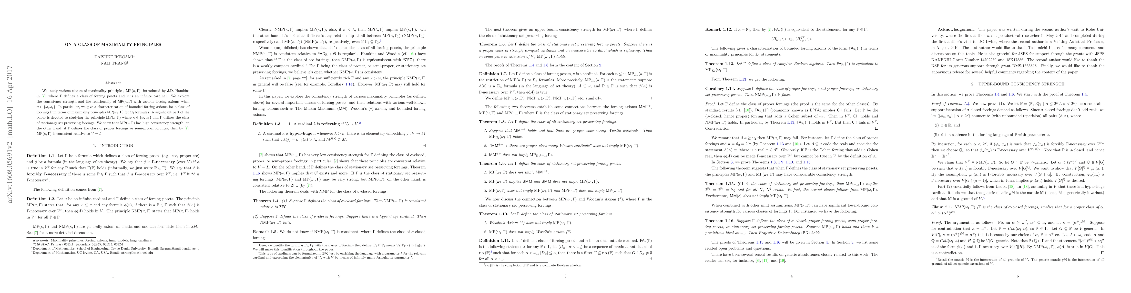 This paper explores maximality principles $\rm{MP}(\kappa,\Gamma)$ introduced by Hamkins, focusing on their consistency strength and relationship with various forcing axioms. It characterizes bounded forcing axioms in terms of maximality principles for $\Sigma_1$ formulas, and shows high consistency strength for stationary set preserving forcings, while proper and semi-proper forcings are consistent relative to $V=L$.