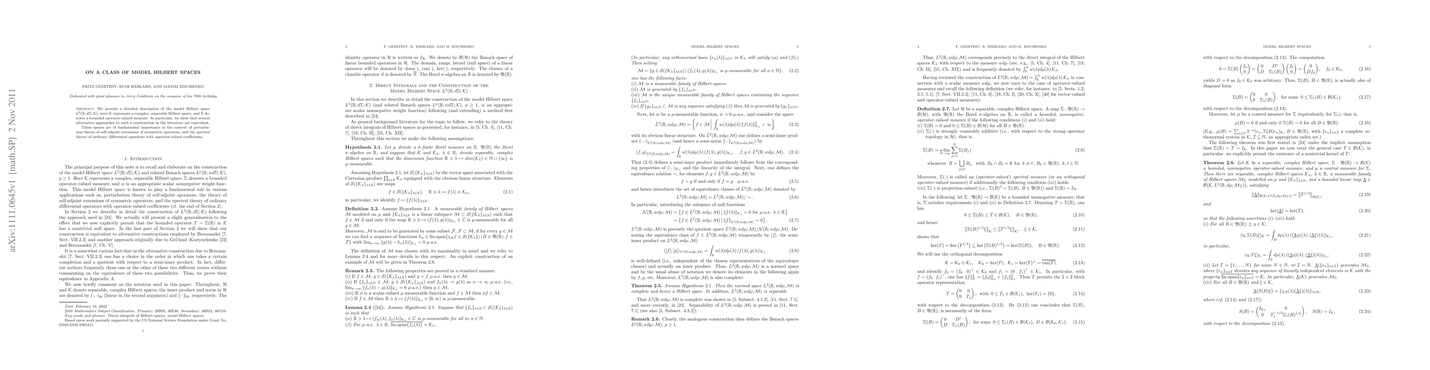We provide a detailed description of the model Hilbert space $L^2(\bbR; d\Sigma; \cK)$, were $\cK$ represents a complex, separable Hilbert space, and $\Sigma$ denotes a bounded operator-valued measure. In particular, we show that several alternative approaches to such a construction in the literature are equivalent. These spaces are of fundamental importance in the context of perturbation theory of self-adjoint extensions of symmetric operators, and the spectral theory of ordinary differential operators with operator-valued coefficients.