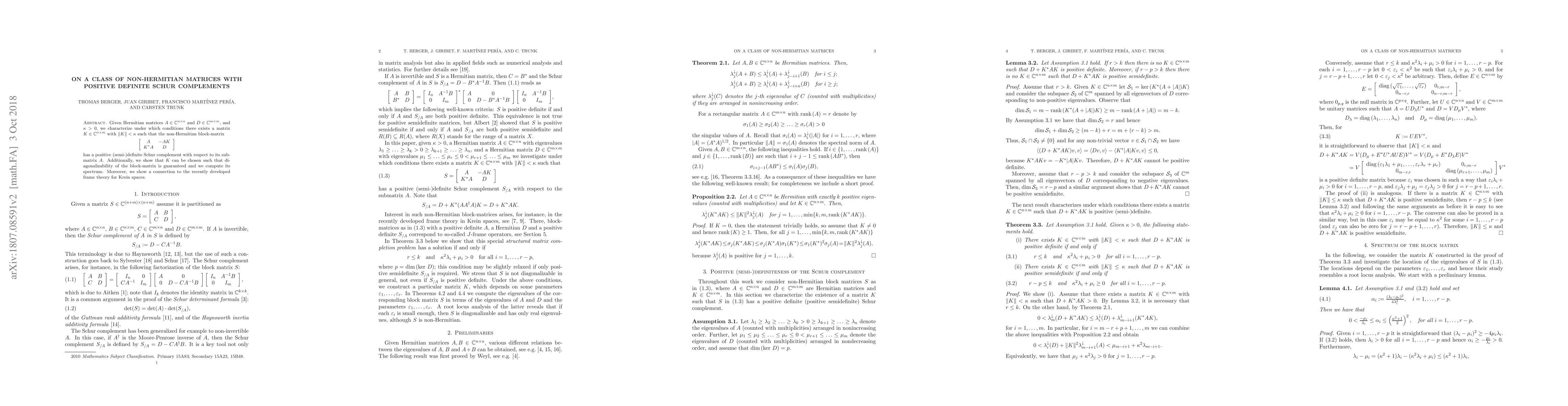 Given a positive definite matrix $A\in \mathbb{C}^{n\times n}$ and a Hermitian matrix $D\in \mathbb{C}^{m\times m}$, we characterize under which conditions there exists a strictly contractive matrix $K\in \mathbb{C}^{n\times m}$ such that the non-Hermitian block-matrix \[ \left[ \begin{array}{cc} A & -AK \\ K^*A & D \end{array} \right] \] has a positive definite Schur complement with respect to its submatrix~$A$. Additionally, we show that~$K$ can be chosen such that diagonalizability of the block-matrix is guaranteed and we compute its spectrum. Moreover, we show a connection to the recently developed frame theory for Krein spaces.