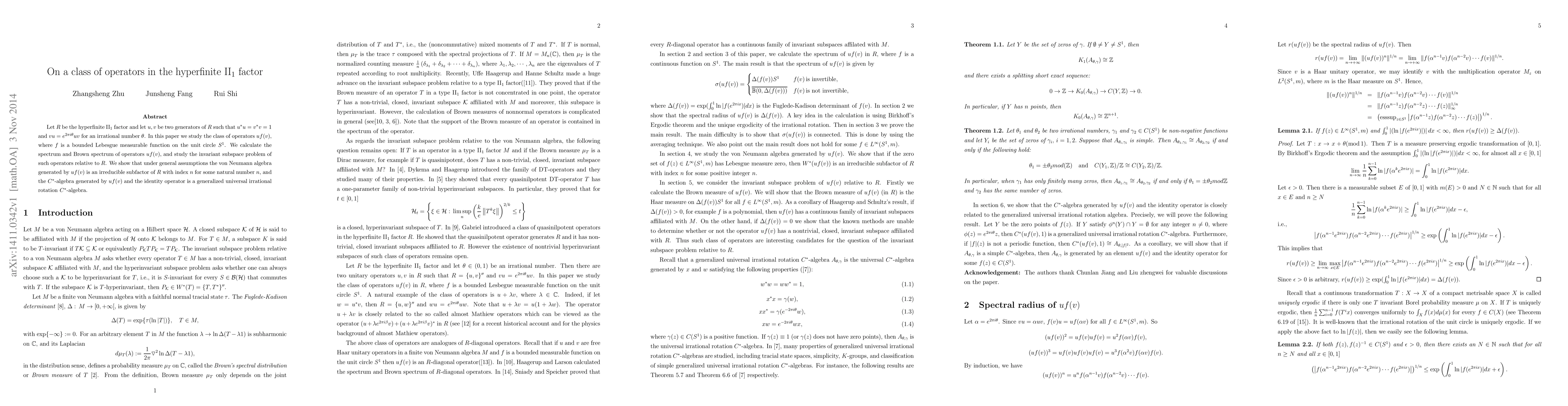 Let $R$ be the hyperfinite ${\rm II}_1$ factor and let $u,v$ be two generators of $R$ such that $u^*u=v^*v=1$ and $vu=e^{2\pi i\theta} uv$ for an irrational number $\theta$. In this paper we study the class of operators $uf(v)$, where $f$ is a bounded Lebesgue measurable function on the unit circle $S^1$. We calculate the spectrum and Brown spectrum of operators $uf(v)$, and study the invariant subspace problem of such operators relative to $R$. We show that under general assumptions the von Neumann algebra generated by $uf(v)$ is an irreducible subfactor of $R$ with index $n$ for some natural number $n$, and the $C^*$-algebra generated by $uf(v)$ and the identity operator is a generalized universal irrational rotation $C^*$-algebra.