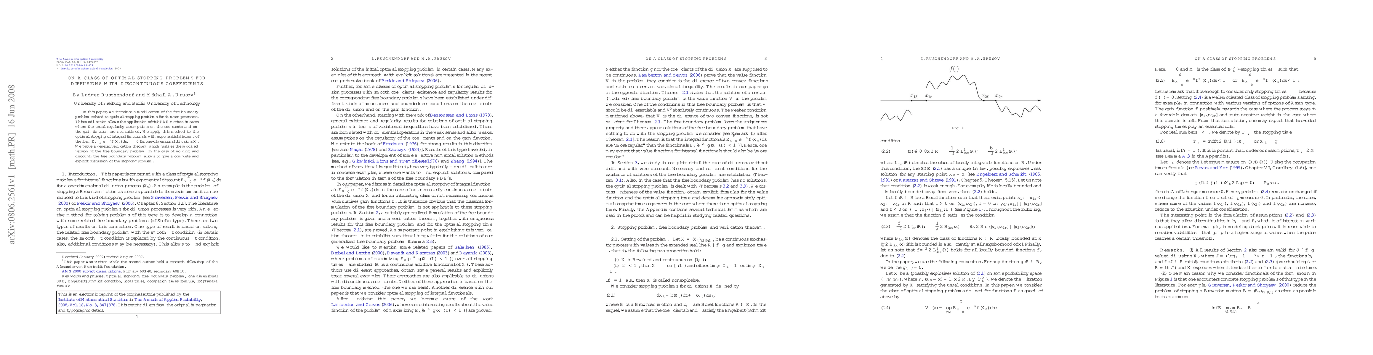 This paper modifies the free boundary problem for optimal stopping of diffusion processes with discontinuous coefficients, allowing application in cases without usual regularity assumptions. It provides a verification theorem and an explicit solution for the stopping problem without drift and discount.