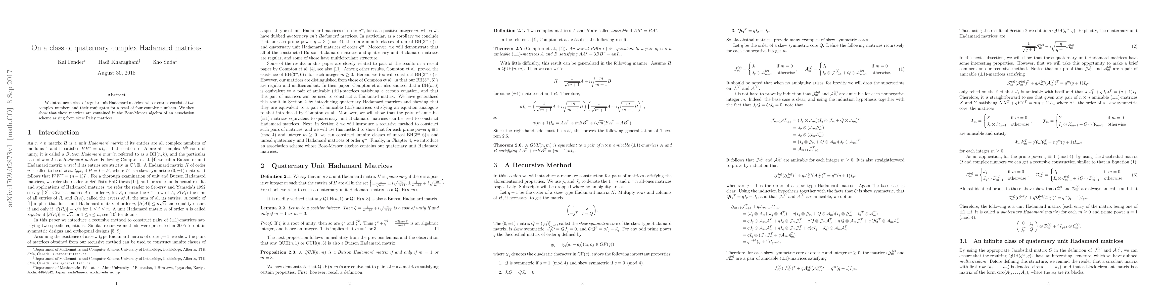 This paper introduces a class of quaternary complex Hadamard matrices composed of two complex numbers and their conjugates, and demonstrates their presence in the Bose-Mesner algebra of an association scheme derived from skew Paley matrices.