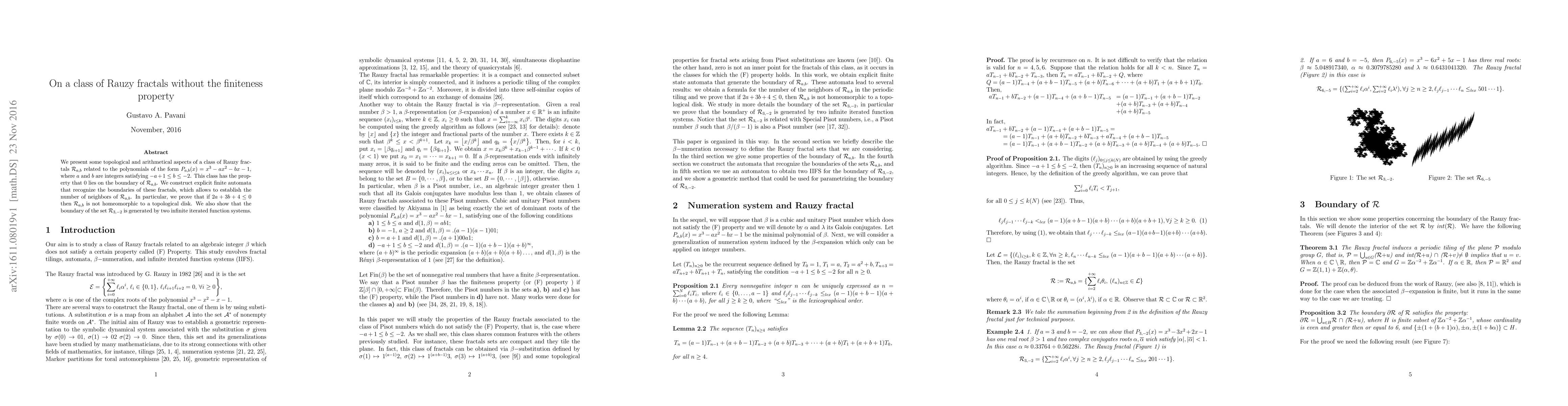 This paper explores a class of Rauzy fractals $\mathcal{R}_{a,b}$ associated with specific cubic polynomials, revealing their topological and arithmetical properties. It demonstrates that these fractals lack the finiteness property and constructs automata to recognize their boundaries, proving that under certain conditions, they are not homeomorphic to a disk.