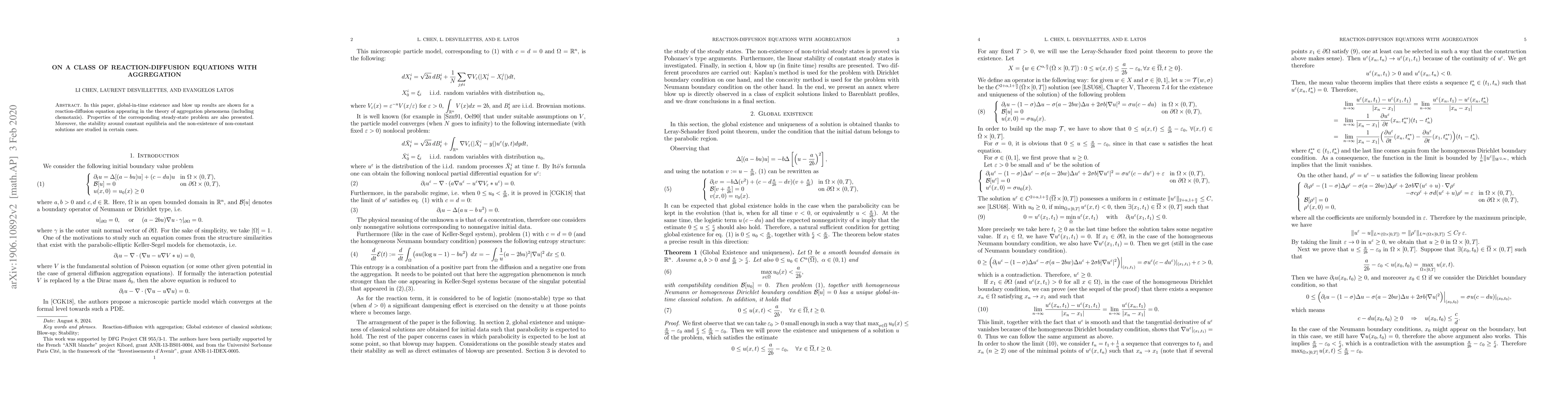 This paper investigates global-in-time existence and blow-up results for a reaction-diffusion equation related to aggregation phenomena, including chemotaxis, and examines the stability of constant equilibria and non-existence of non-constant solutions in specific cases.