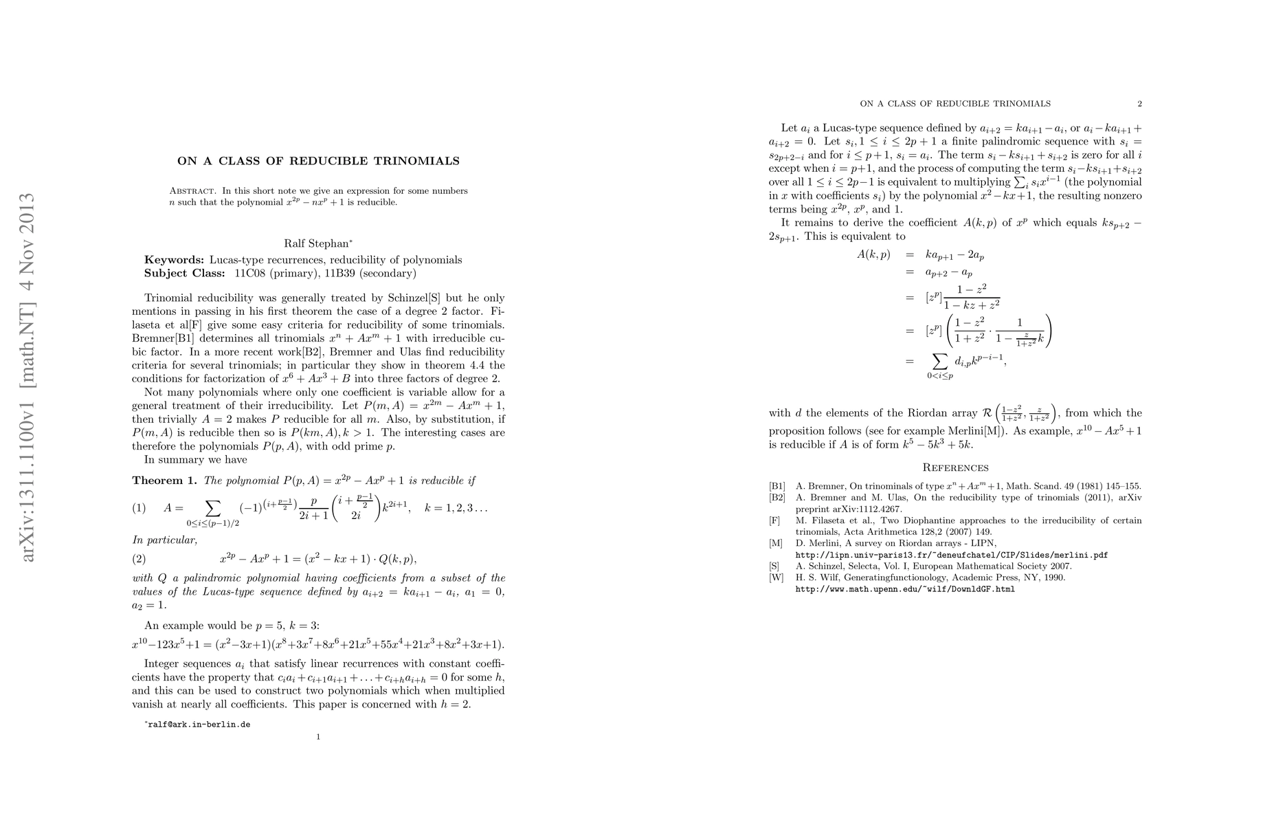 In this short note we give an expression for some numbers $n$ such that the polynomial $x^{2p}-nx^p+1$ is reducible.