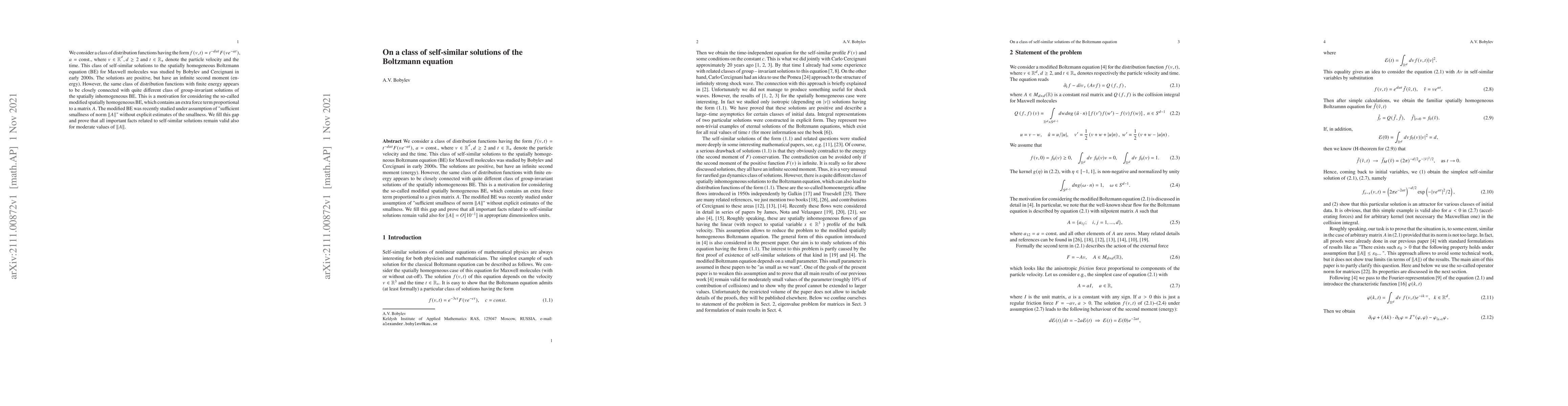 We consider a class of distribution functions having the form $ f(v,t)=t^{-dat} F(v e^{-at} )$, $ a=\mathrm{const.} $, where $ v $ and $ t $ denote the particle velocity and the time. This class of self-similar solutions to the spatially homogeneous Boltzmann equation (BE) for Maxwell molecules was studied by Bobylev and Cercignani in early 2000s. The solutions are positive, but have an infinite second moment (energy). However, the same class of distribution functions with finite energy appears to be closely connected with quite different class of group-invariant solutions of the spatially inhomogeneous BE. This is a motivation for considering the so-called modified spatially homogeneous BE, which contains an extra force term proportional to a matrix $ A $. The modified BE was recently studied under assumption of "sufficient smallness of norm $ \|A\| $" without explicit estimates of the smallness. We fill this gap and prove that all important facts related to self-similar solutions remain valid also for moderate values of $ \|A\| $.