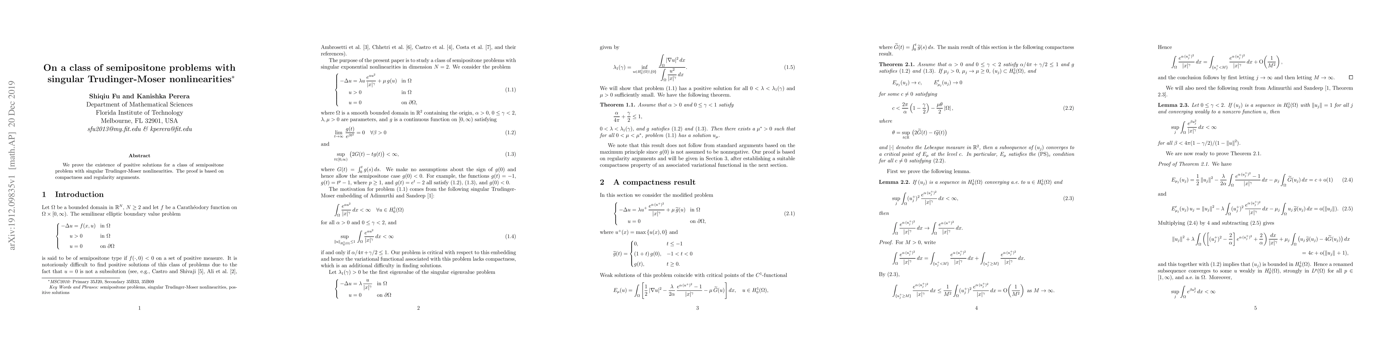 Summary: This paper establishes the existence of positive solutions for semipositone problems featuring singular Trudinger-Moser nonlinearities, utilizing compactness and regularity arguments to support the proof.