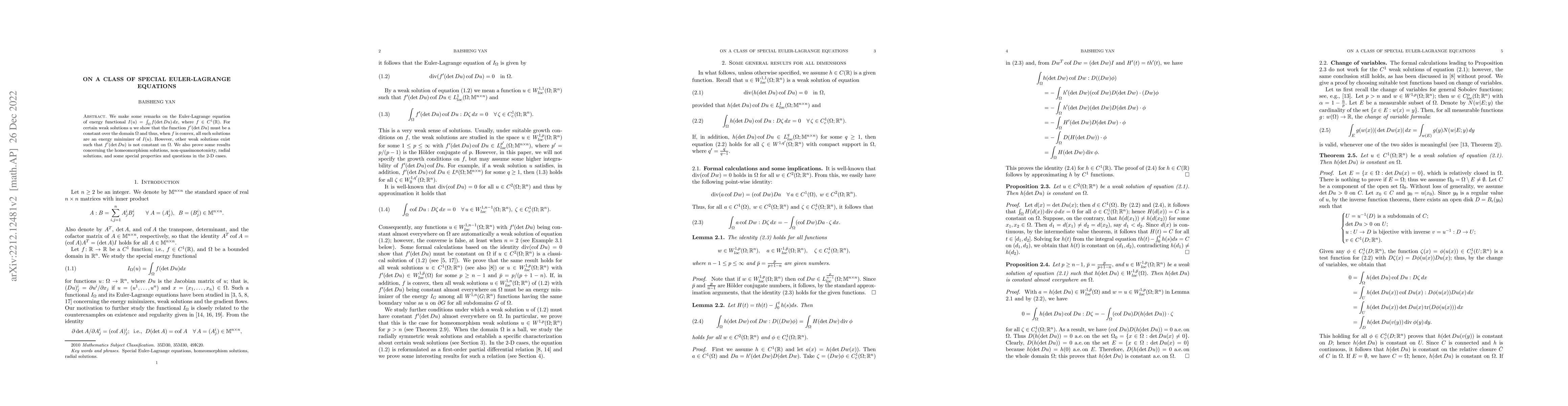 This paper investigates the Euler-Lagrange equation associated with the energy functional $I(u)$ involving the determinant of the gradient of $u$. It demonstrates that for certain weak solutions, $f'(\det Du)$ is constant, implying energy minimization when $f$ is convex, while other solutions exist where $f'(\det Du)$ varies. It also explores properties of homeomorphism solutions and special cases in two dimensions.