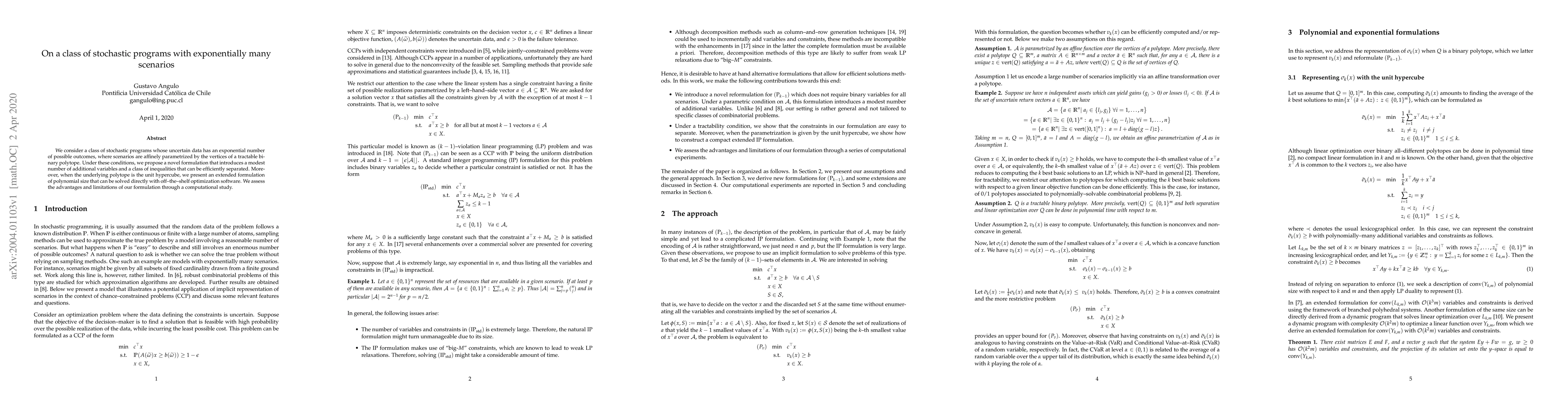 We consider a class of stochastic programs whose uncertain data has an exponential number of possible outcomes, where scenarios are affinely parametrized by the vertices of a tractable binary polytope. Under these conditions, we propose a novel formulation that introduces a modest number of additional variables and a class of inequalities that can be efficiently separated. Moreover, when the underlying polytope is the unit hypercube, we present an extended formulation of polynomial size that can be solved directly with off--the--shelf optimization software. We assess the advantages and limitations of our formulation through a computational study.